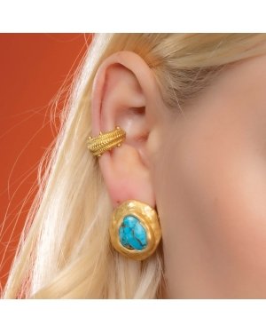 Add a touch of modern elegance to your look with this Gold Plated Dotted Ripple Ear Cuff, designed for women who love refined designer jewelry.Featuring a dotted ripple texture inspired by flowing metal waves, this ear cuff delivers a subtle yet striking statement. Crafted from premium brass alloy and finished with 22KT real gold plating, it offers long-lasting shine, durability, and a premium feel.The piercing-free slip-on design ensures easy wear and all-day comfort. This single-piece ear cuff is ideal for everyday styling, parties, festive occasions, and designer wear looks. Pair it with minimal jewelry or wear it solo for a chic, contemporary finish.Key Features:Piercing Free Ear Cuff – No piercing requiredDotted Ripple Texture – Elegant designer finishSingle Piece Statement Design22KT Real Gold Plating on premium brass alloyLightweight, adjustable & comfortable fitPerfect for casual, party & festive wearA must-have accessory for women who prefer minimal yet luxurious designer jewelry.