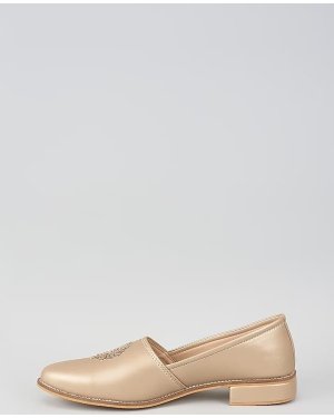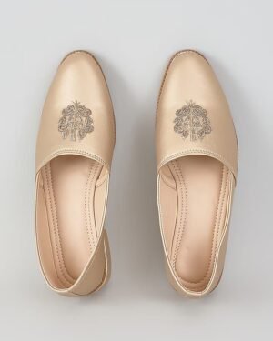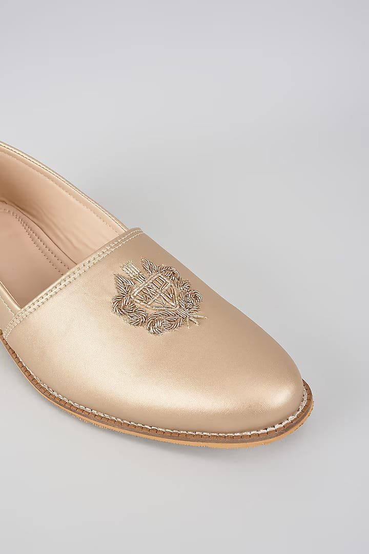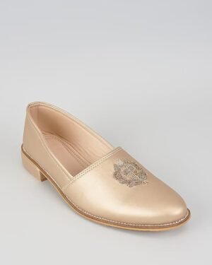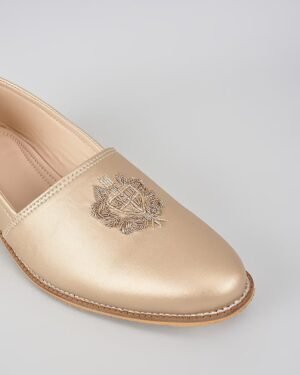 A pair of muted golden artificial leather based slip on juttis enhanced with zari embroidered royal crest. It has a padded leather lining and a hard sheeted rubber sole.