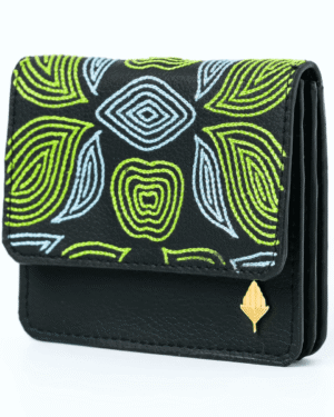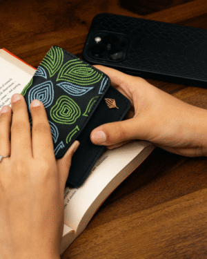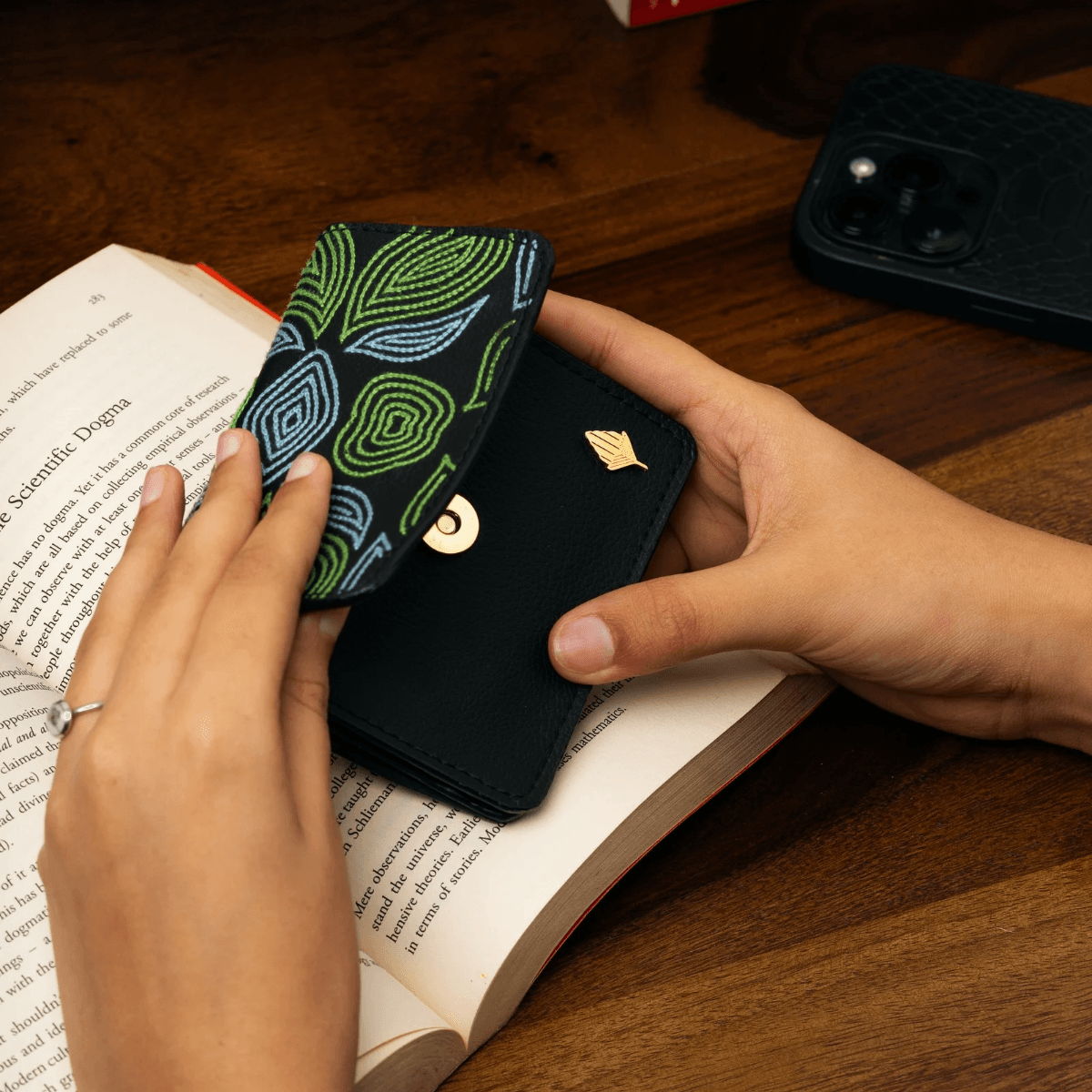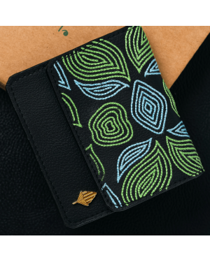 Hand-embroidered expandable cardholder crafted from plant-based leather, combining artisanal beauty with everyday functi