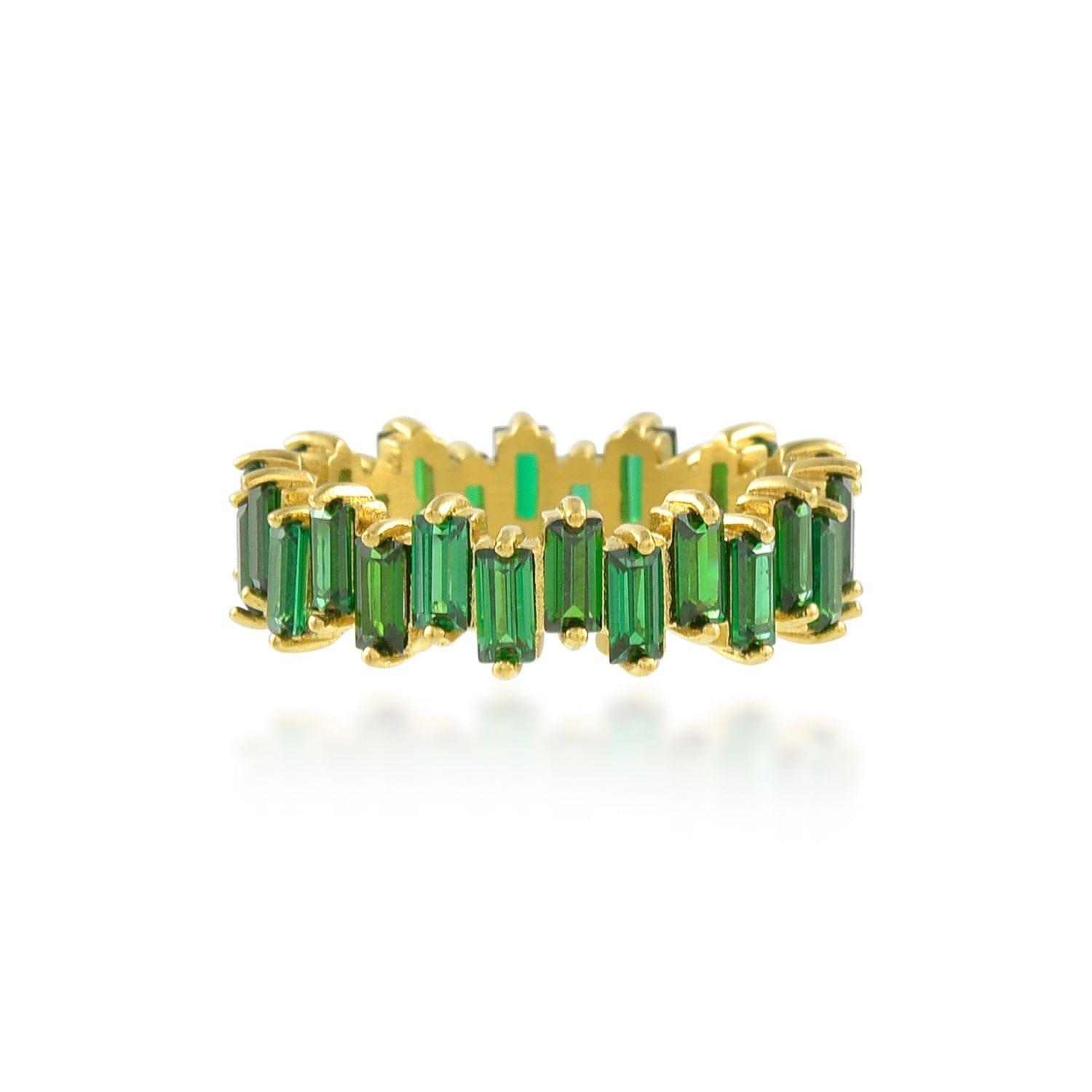 Radiate elegance with the Emerald Glow Band, a dazzling eternity ring adorned with vibrant green zircon stones. The geom