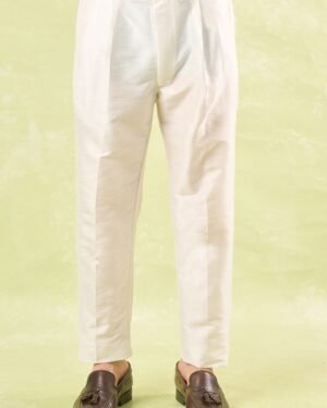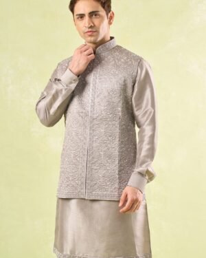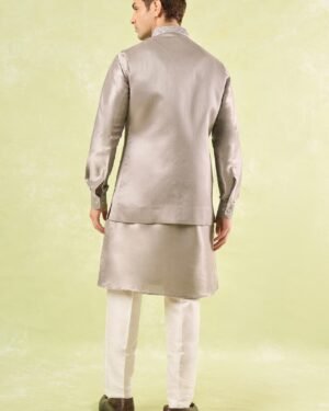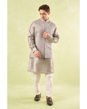 Grey raw silk based jacket enhanced with pearl and cut dana embroidery paired with a matcing cotton silk based kurta and an off white dupion silk based mexican pants.