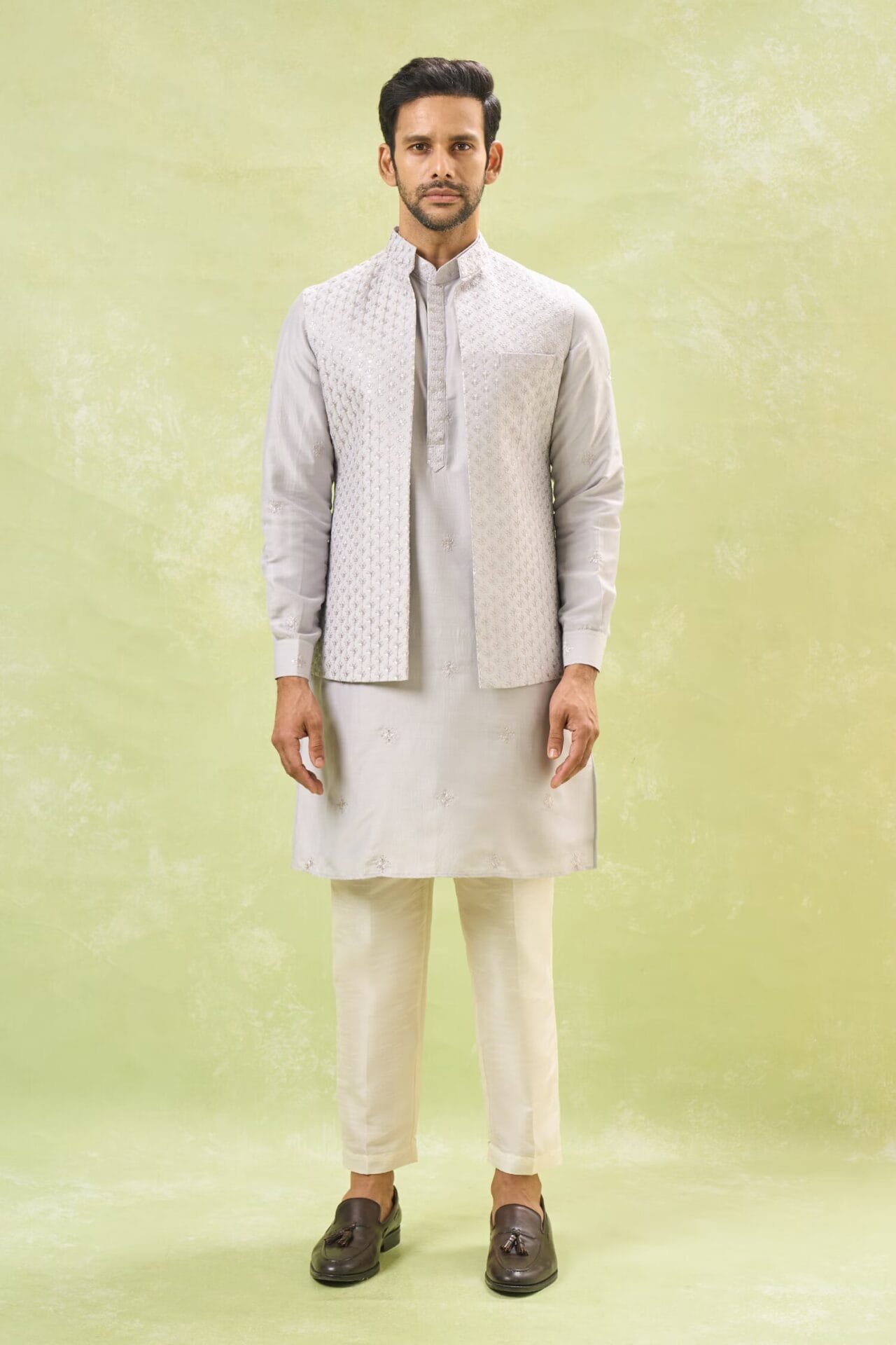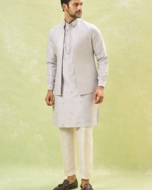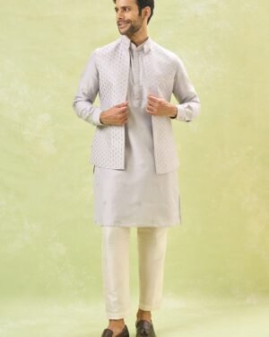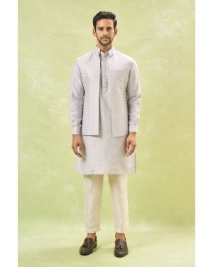 Grey cotton silk open jacket with thread and sequin embroidery, paired with a matching cotton silk based embroidered kurta and an off white cotton silk based pants.