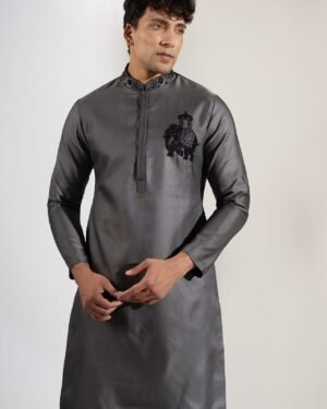 Grey ombre cotton silk based kurta enhanced with black cutdana motif embroidery, paired with black dupion silk based pants