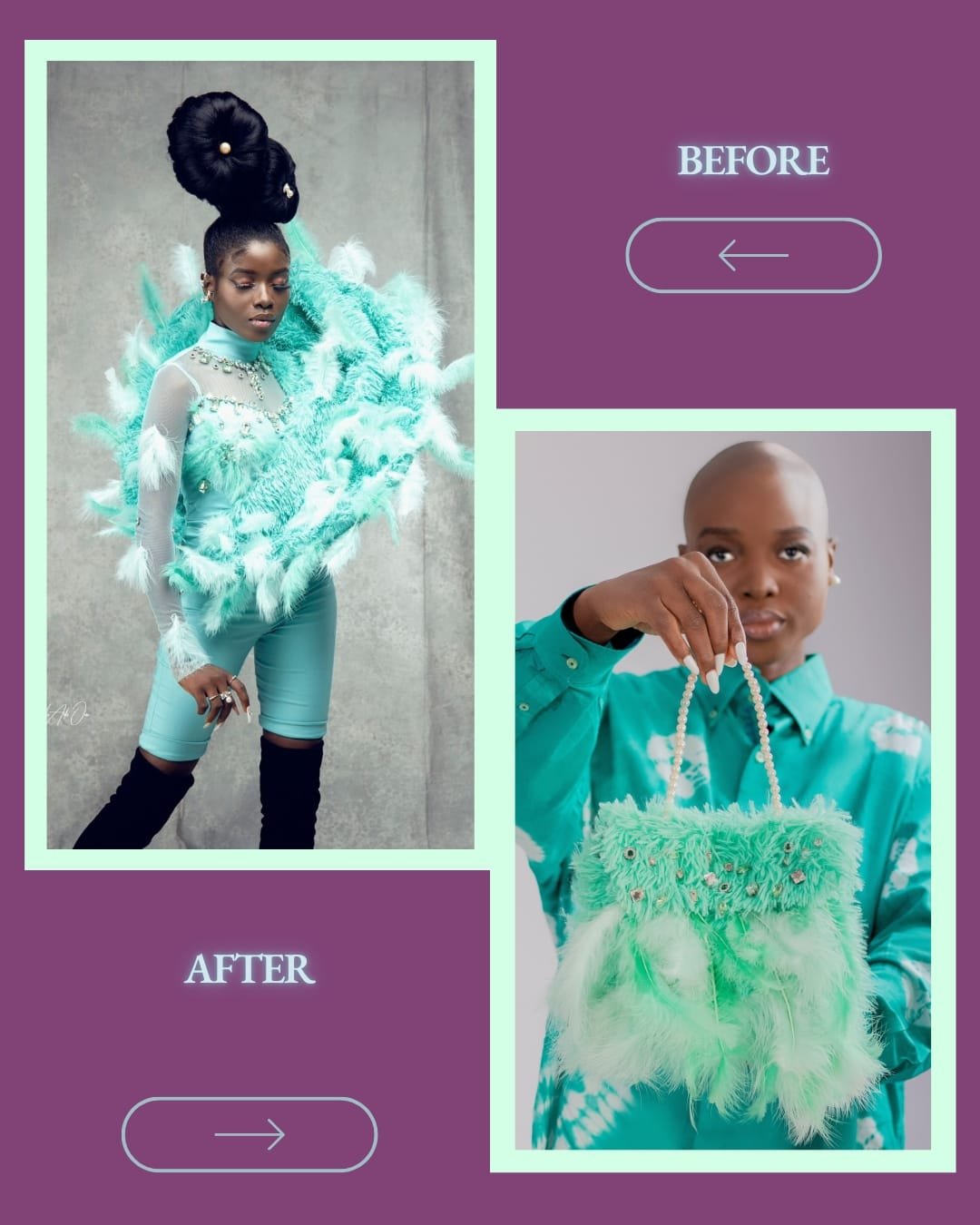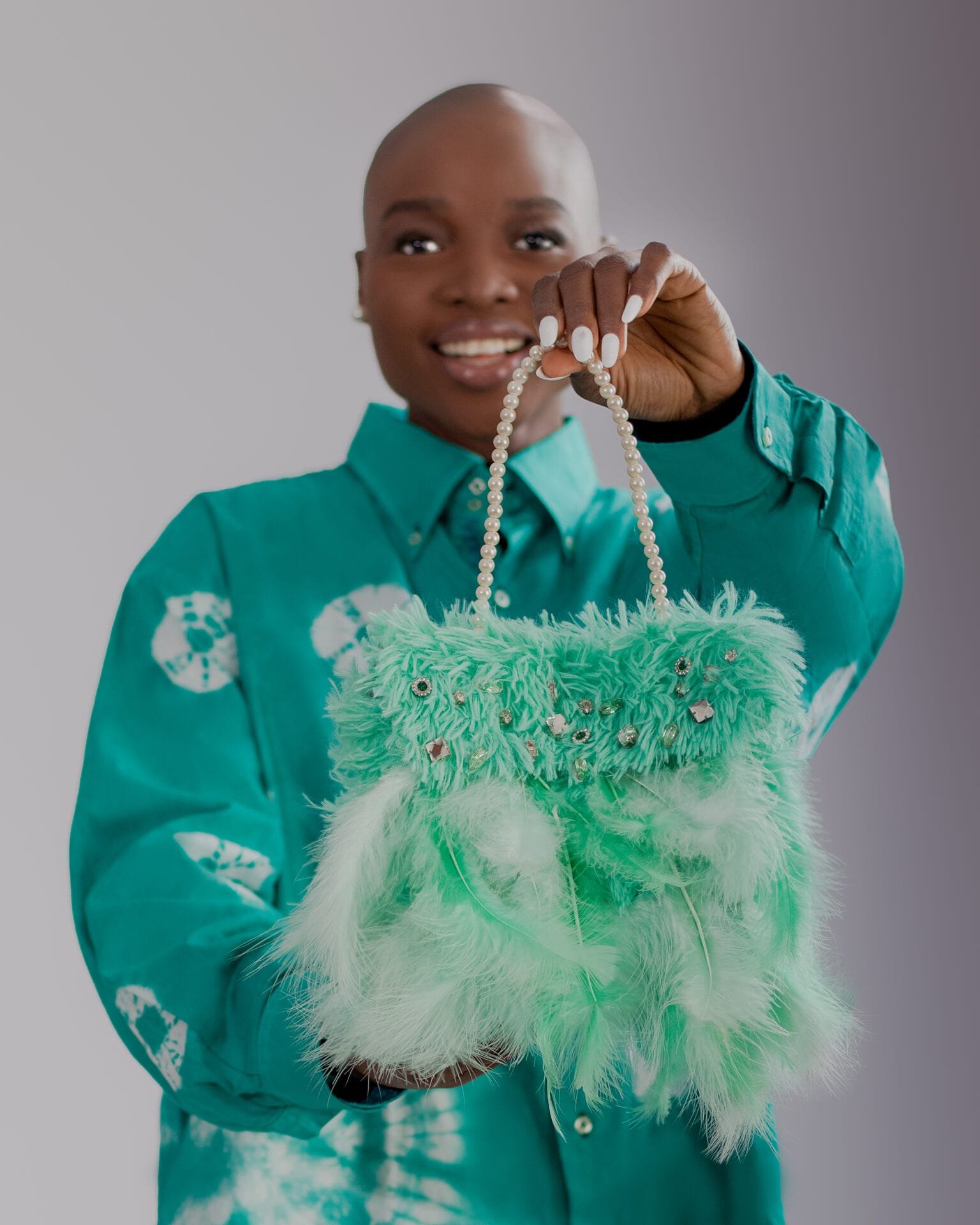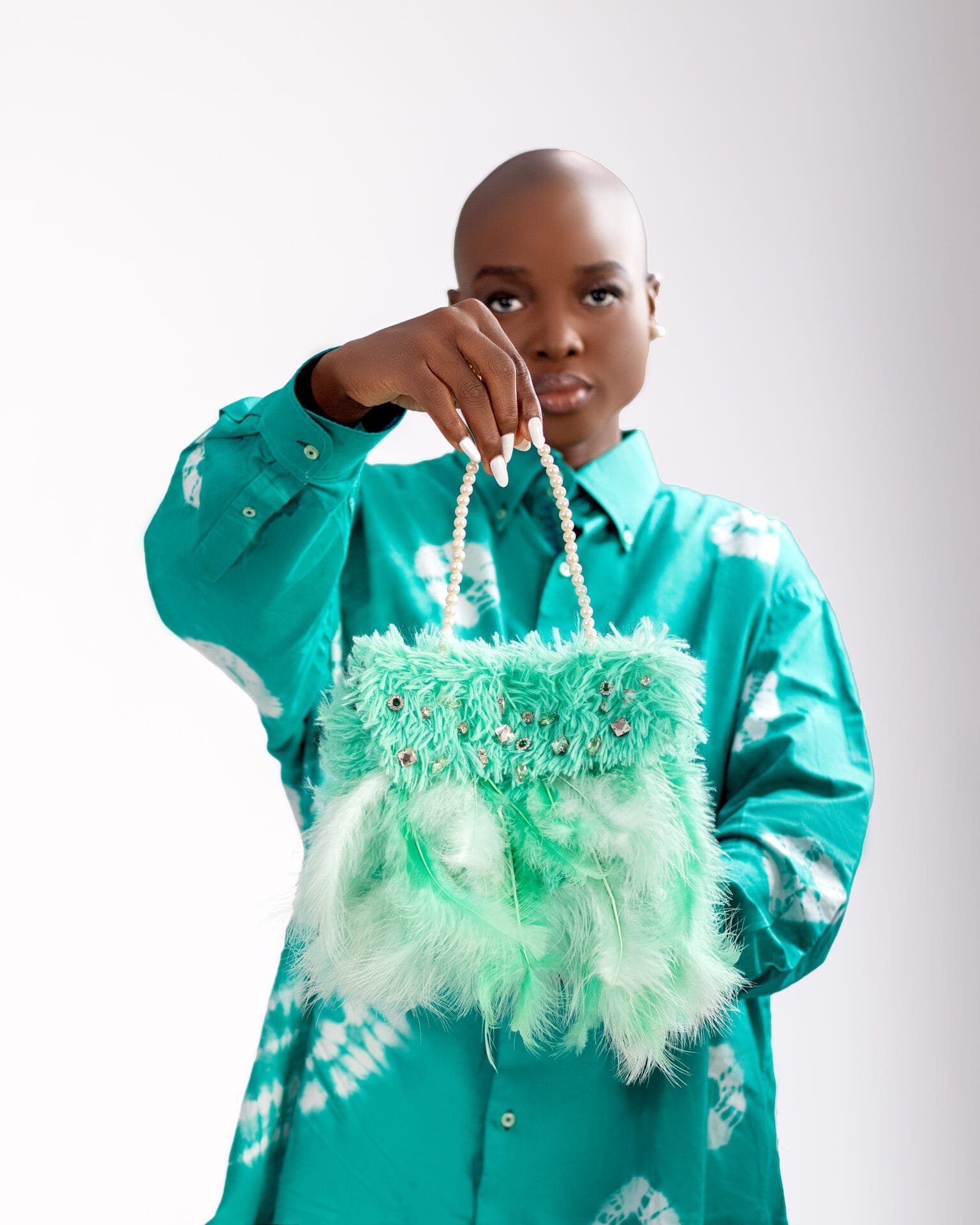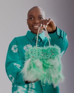 Hand purse finished with cloth feathersÂ