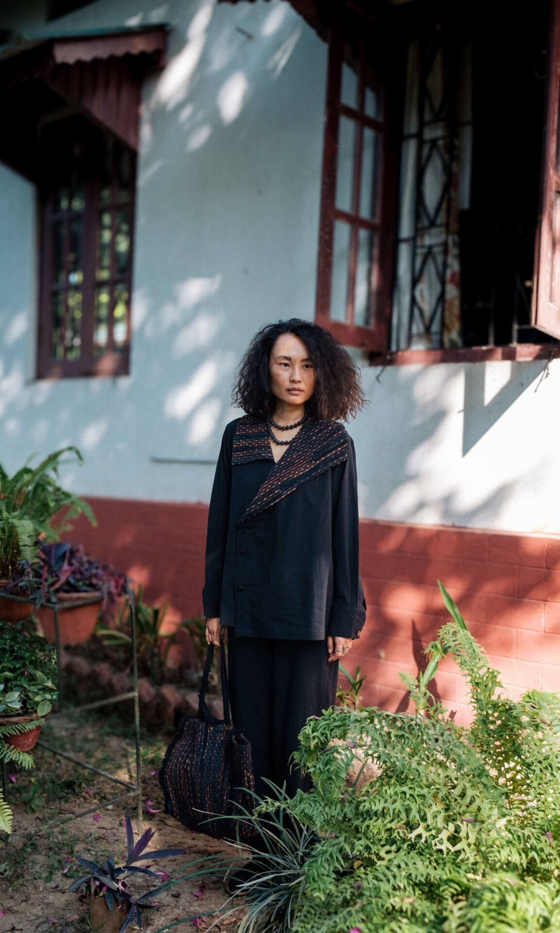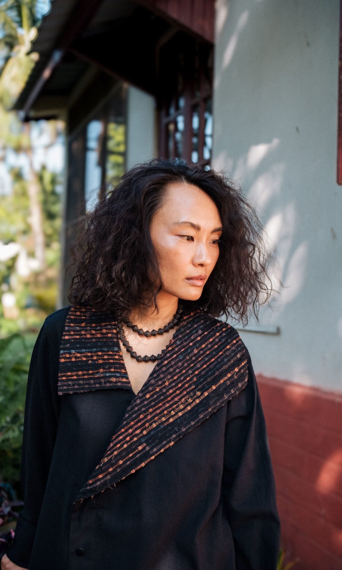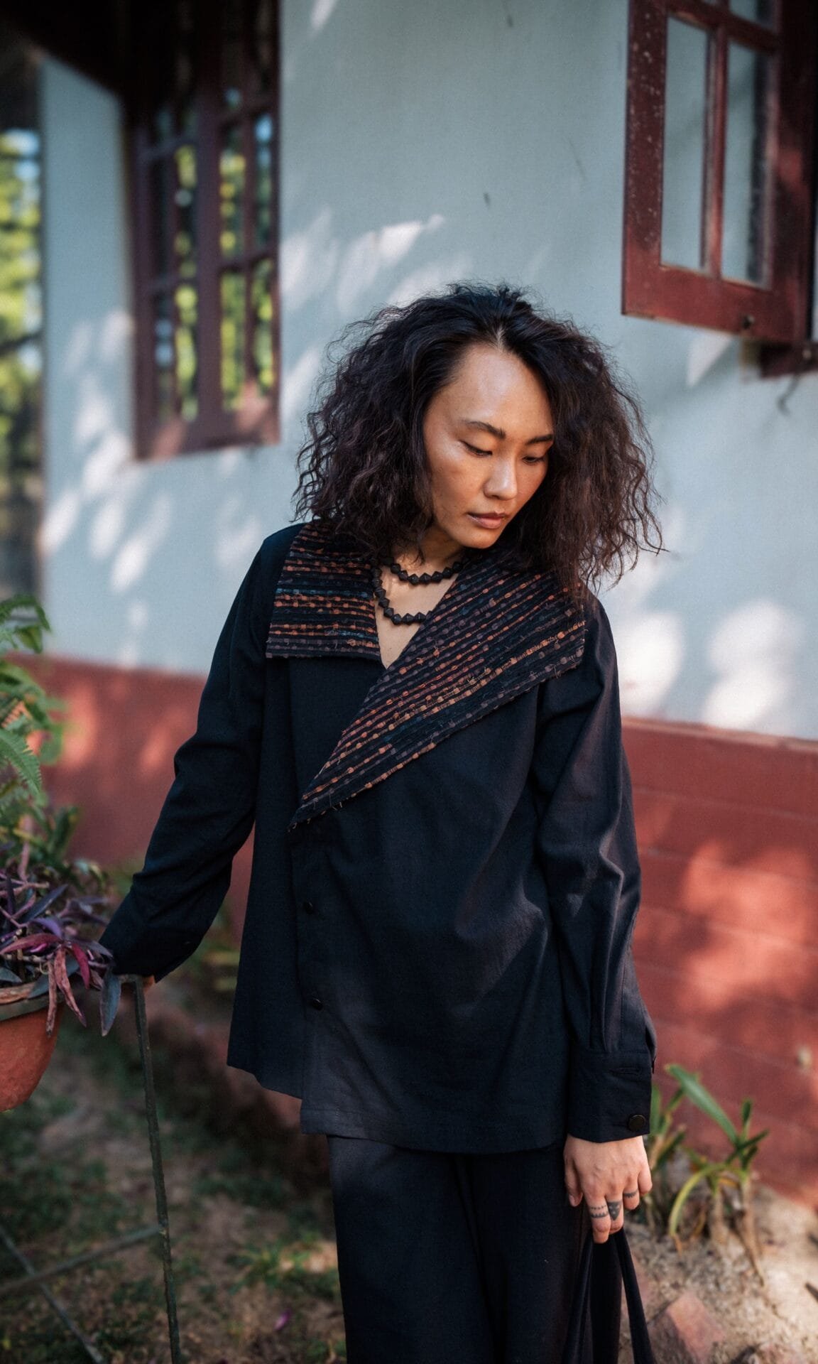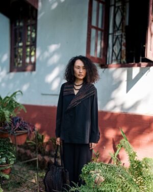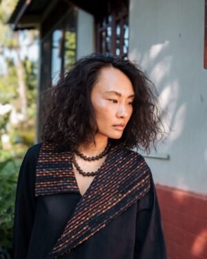 The garment is made from hand woven upcycled fabric and so the color might vary slightly for each batch.