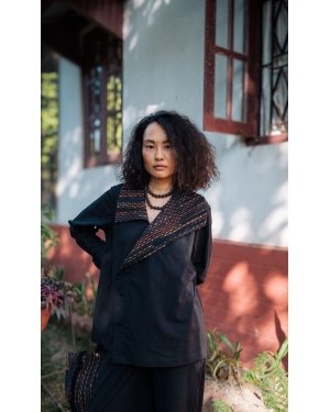 This shirt featuring a statement collar and a slight cinch at the waist is the perfect balance between classic and edgy, pairs perfectly with our barrel pants. The collar is designed from upcycled fabric, made using post production waste.