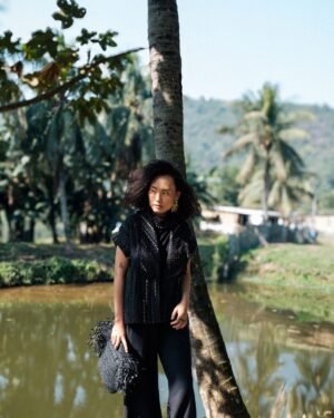 The garment is made from hand woven upcycled fabric and so the color might vary slightly for each batch.