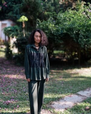 The garment is made from hand woven upcycled fabric and so the color might vary slightly for each batch.