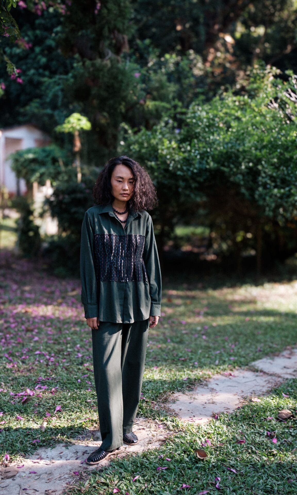 This shirt features a patch detail designed from upcycled fabric, made using post production waste, creating the most perfect cinch on the waist. An elevated classic shirt that pairs perfectly with our barrel pants.