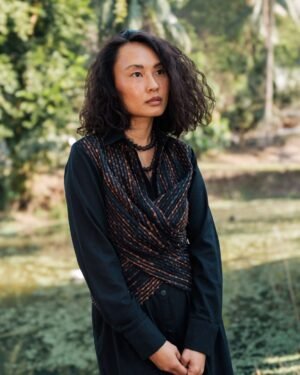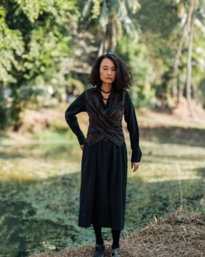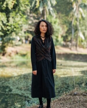 The garment is made from hand woven upcycled fabric and so the color might vary slightly for each batch.