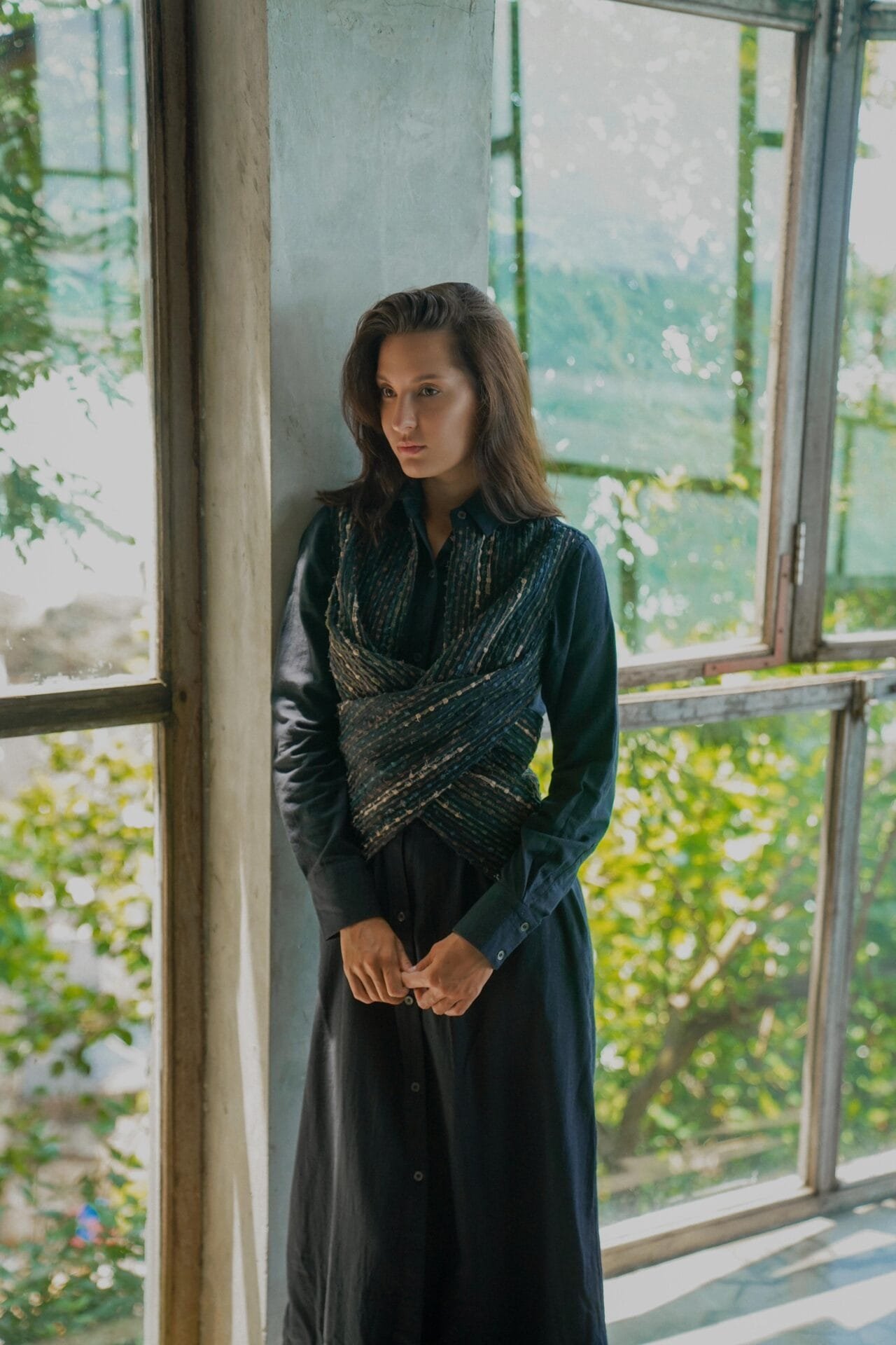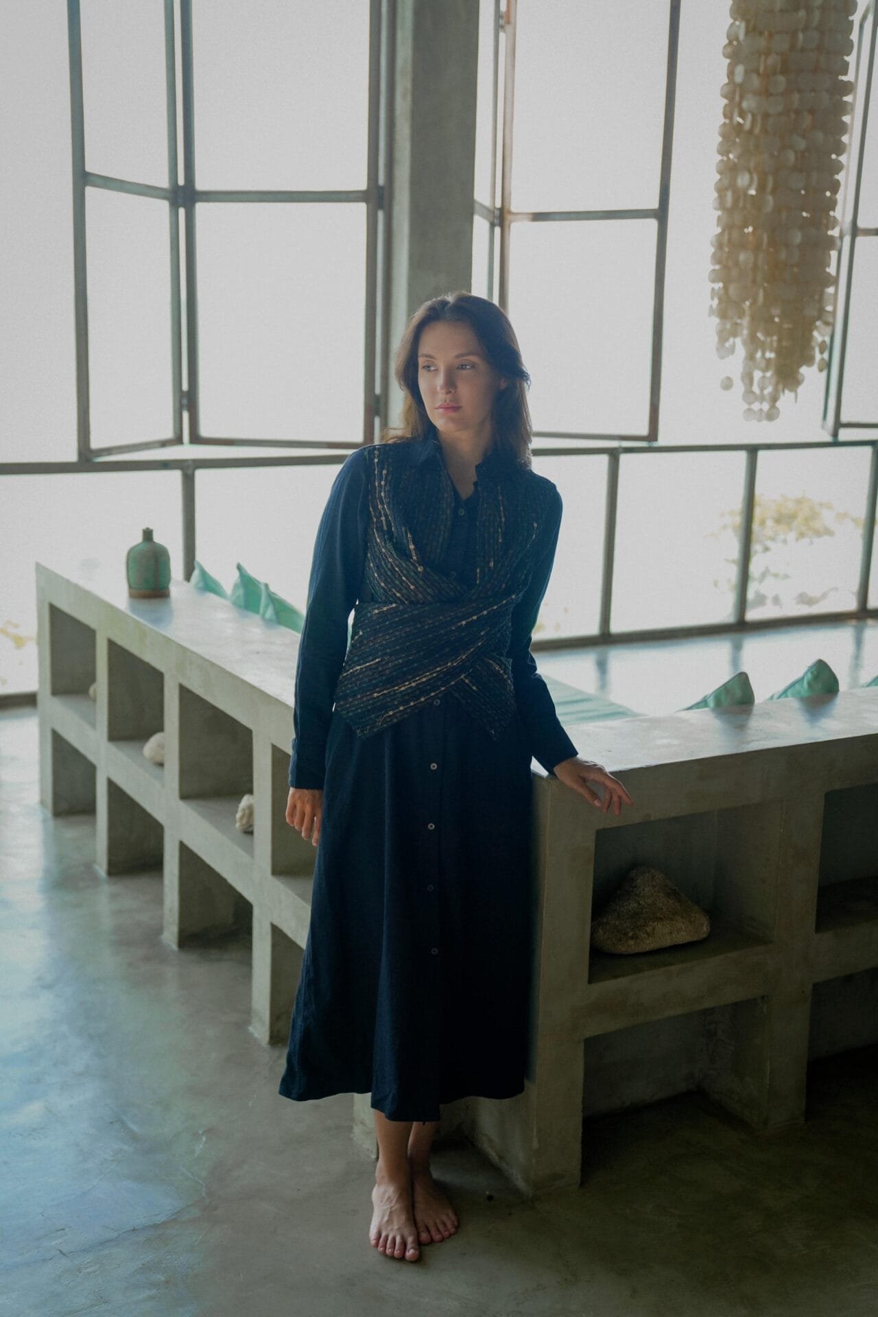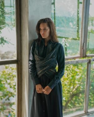 A truly exquisite wrap shirt midi dress that seamlessly transforms from a sophisticated staple to a casually chic garment designed from upcycled fabric, made using post production waste.