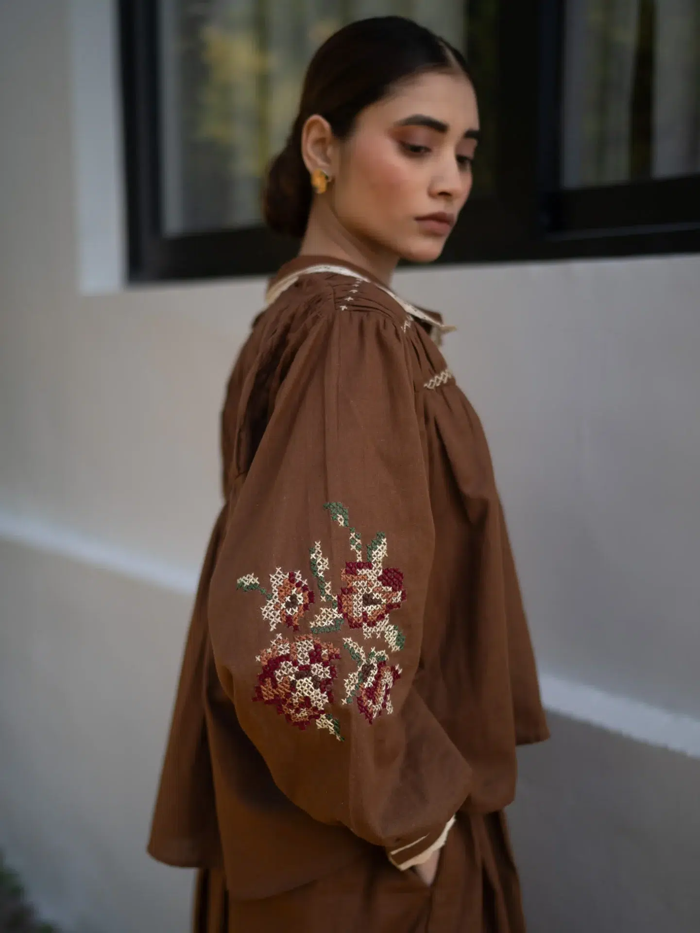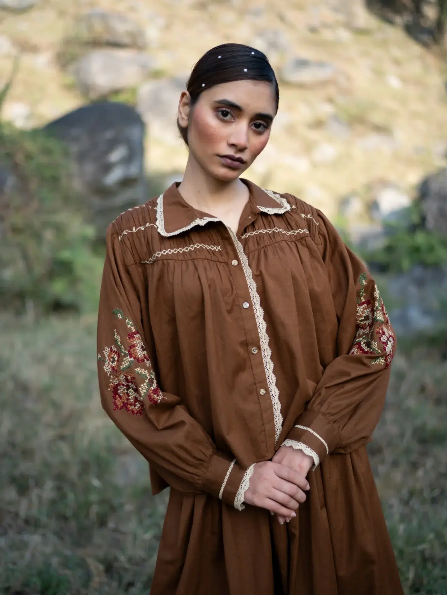 A cotton top crafted with a fully smocked front and back yoke, layered with fine embroidery for subtle texture. The sleeves feature 800+ hand-stitched cross stitches, celebrating meticulous artisanal work. Finished with lace inserts at the front, collar, and cuffs, it brings a soft, vintage charm to everyday dressing.