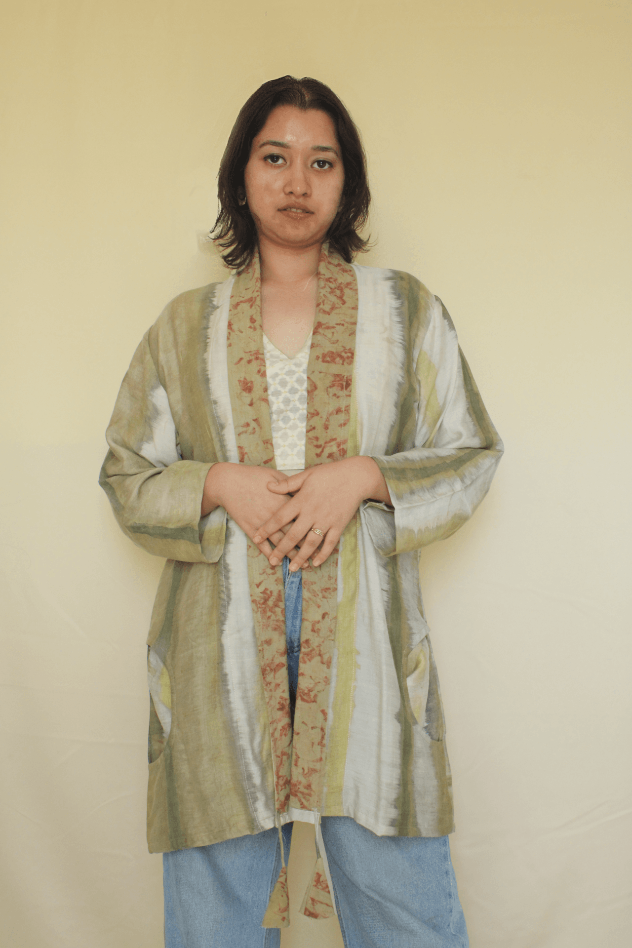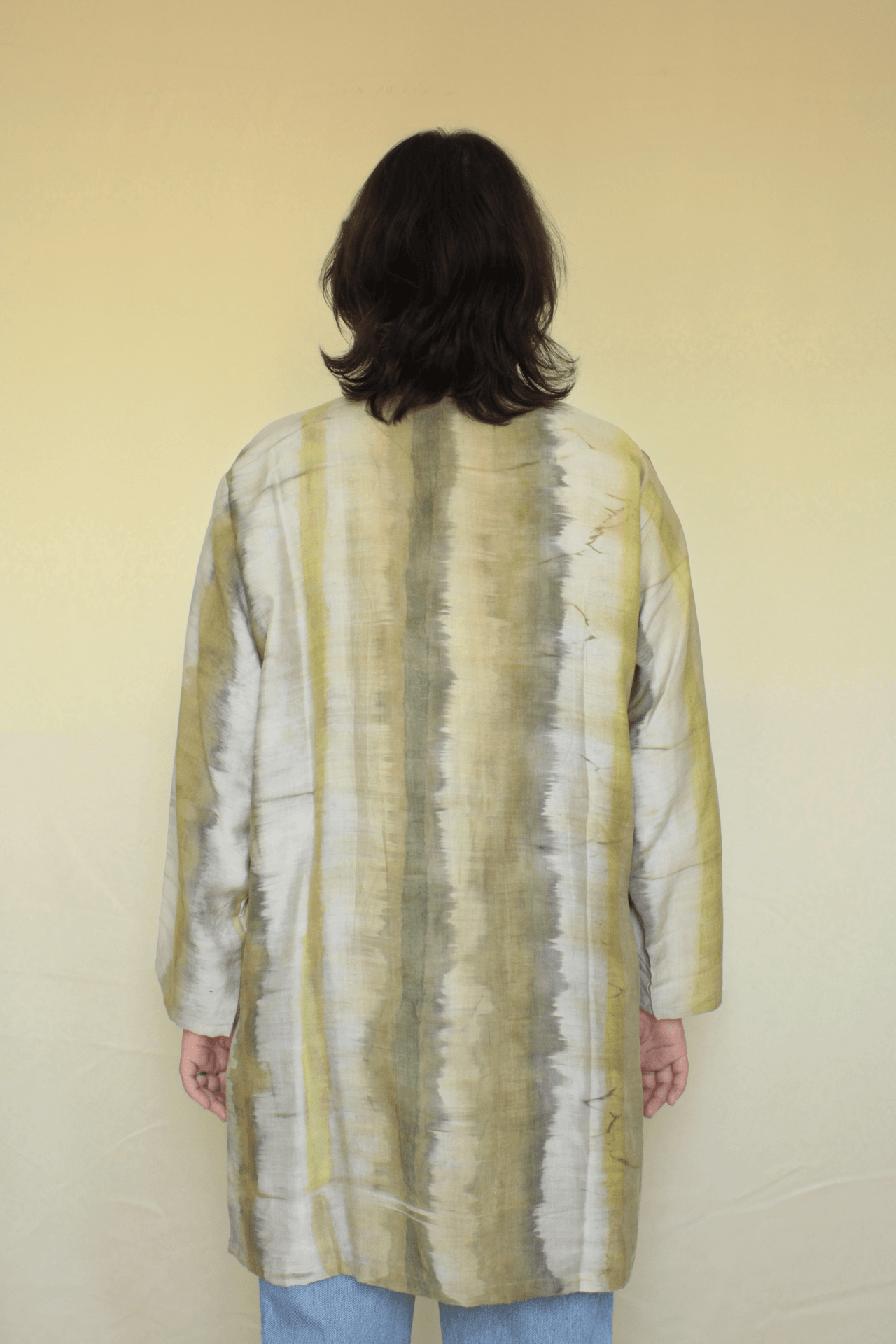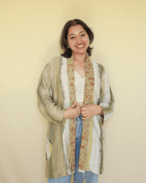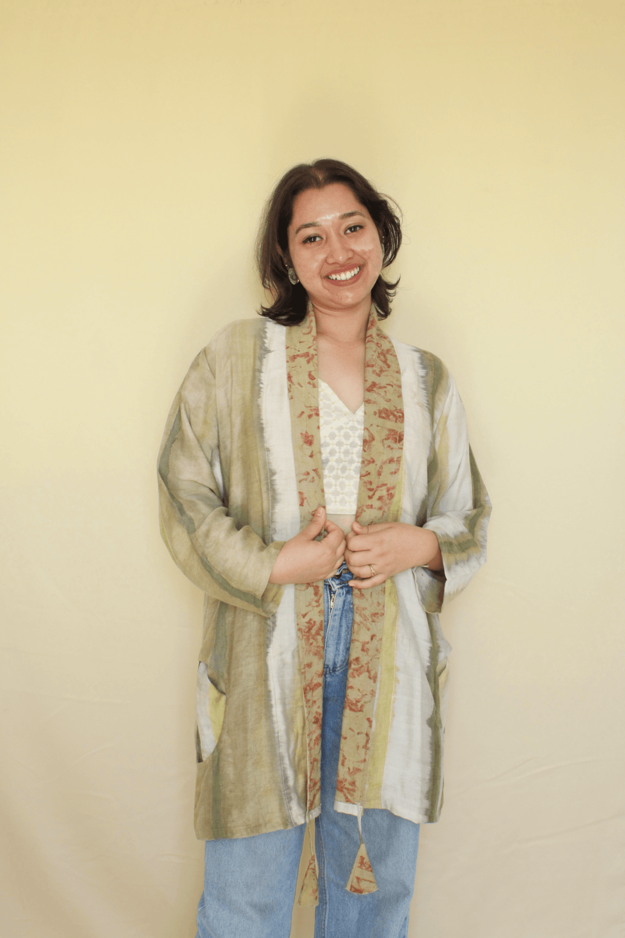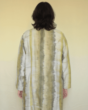 Bageeya’s “Herbal Hippie” eco-conscious jacket is from khadi tussar cotton and dyed using natural Harda, a sacred temple flower and Indigo . This sustainable process reduces marine pollution and embodies the spirit of mindful living. The jacket features a zero-waste shawl collar made from katran and elegant tassels at the bottom. Khadi Tussar Cotton: Crafted by skilled artisans, the fabric is lightweight, breathable, and drapes beautifully. Khadi tussar cotton is known for its natural sheen and unique texture, making it a luxurious and comfortable choice.Natural Harda Dye: Sourced from sacred temple flowers, Harda is a natural and eco-friendly dye that produces a beautiful color. This process avoids harmful chemicals and reduces marine pollution, making a positive impact on the environment. Shawl Collar with Zero-Waste Katran: The stylish shawl collar is meticulously crafted from katran, ensuring no fabric goes to waste. This design element adds a touch of sophistication and warmth