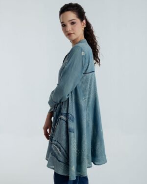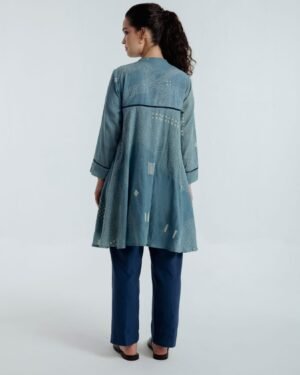 This exquisite co-ord set is adorned with Bagru’s traditional Dabbu mud-resist prints and detailed with intricate hand embroidery, a harmonious blend of craftsmanship and elegance. The relaxed silhouette drapes with effortless grace, flattering the figure while offering day-long comfort.Delicate blue and white French knots, hand-embroidered into dots and lines, form subtle, organic motifs that lend a quiet charm. Bold Dabbu patterns add depth and thoughtful engineered placement, while intricate embroidery trails along the sides of the skirt, creating a touch of movement. Finishing the look, natural shell buttons bring a refined, artisanal detail.Versatile and timeless, Fayra transitions seamlessly from casual daytime wear to elegant evening gatherings, pairing beautifully with countless pieces in your wardrobe.Garment length: Shirt – 34” | Pant – 39”Sleeve length:15”Model height: 5’7” (wearing size S)