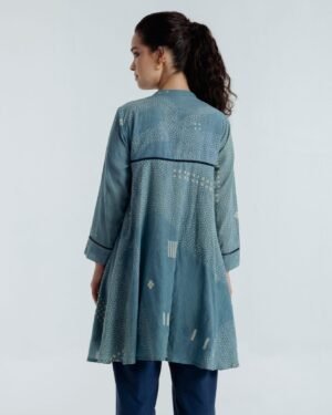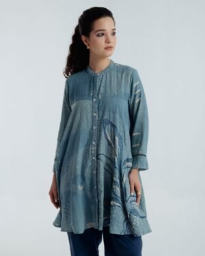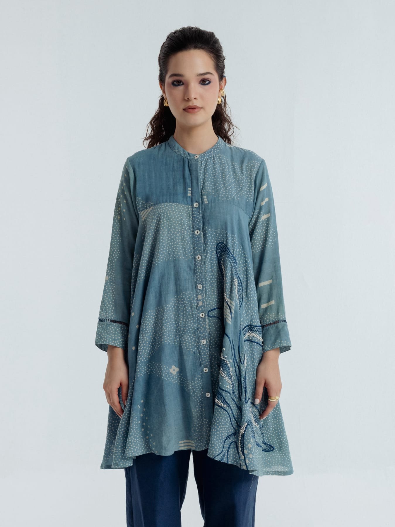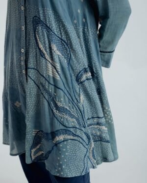 This exquisite shirt showcases fine embroidery along the sides and back, accentuating the fitted upper bodice and lending elegant volume to its shape. Delicate white and blue French knots and embroidered dots, all done by hand, create a subtle organic pattern that feels both understated and enchanting. The shirt features a front closure with shell buttons for a refined touch.Designed for a polished fit across the chest, the shirt offers a graceful, effortlessly elegant silhouette.Garment length: 34 inchesSleeves length: 20 inchesModel height: 5’7”, wearing size S