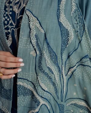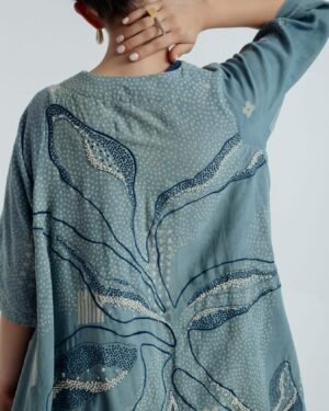 This exquisite overlay is adorned with Bagru’s traditional Dabbu mud-resist prints and intricate embroidery — a perfect blend of heritage craftsmanship and contemporary elegance. The relaxed silhouette drapes beautifully, enhancing the figure while ensuring all-day comfort.Delicate blue and white hand-embroidered French knots trace subtle, organic motifs, while bold Dabbu patterns add depth and thoughtfully engineered placement. Every inch is touched by hand embroidery, making Fayra a statement piece perfect for special occasions.Versatile and timeless, it pairs beautifully with a variety of ensembles, earning its place as an everyday essential.Garment length: Front – 24 inches Back – 28 inchesSleeve length: 15 inchesModel height: 5’7” (wearing size S)