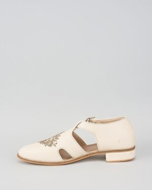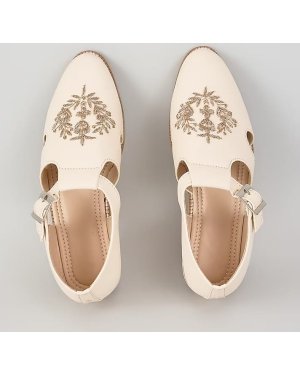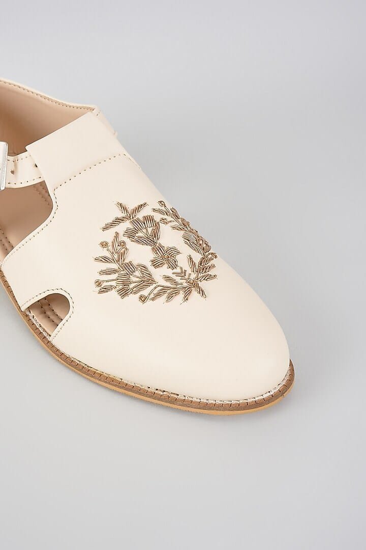 A pair of off white artificial leather based slip on sandals enhanced with zari embroidered royal crest. It has a padded leather lining and a hard sheeted rubber sole.