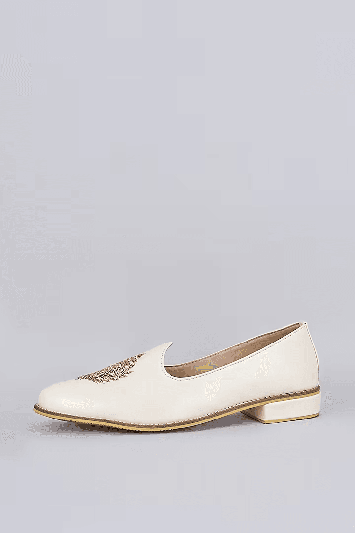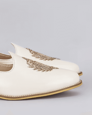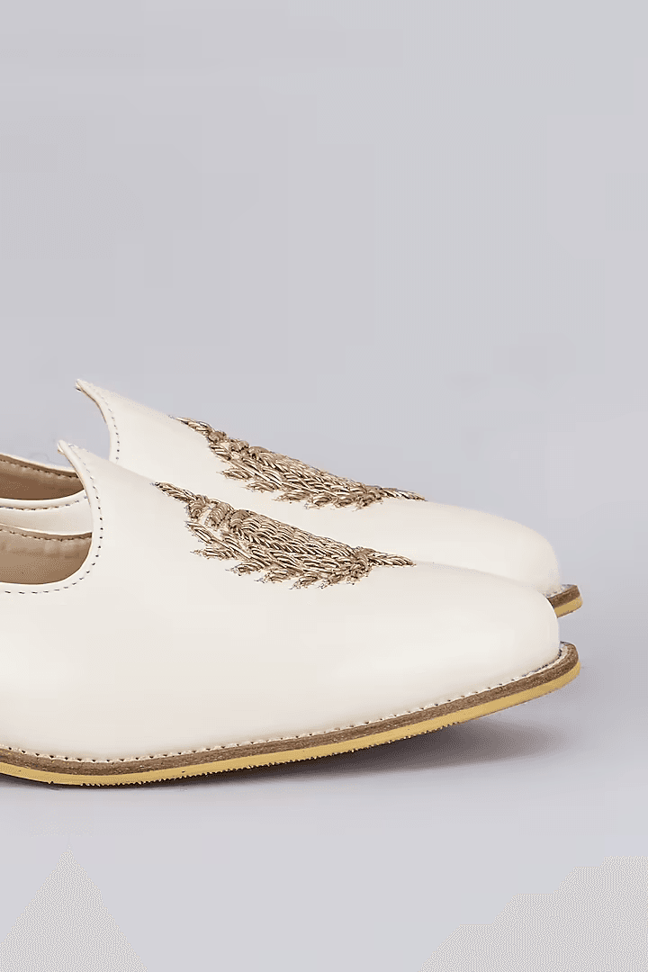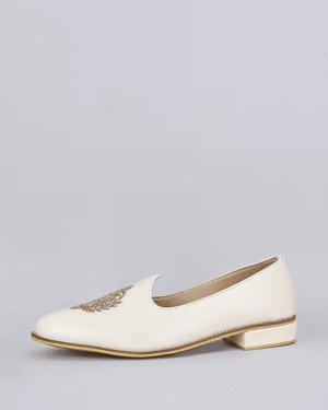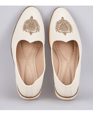 A pair of off white leather based slip on juttis enhanced with zari embroidered royal crest. It has a padded leather lining and a hard sheeted rubber sole.