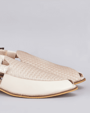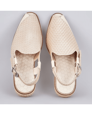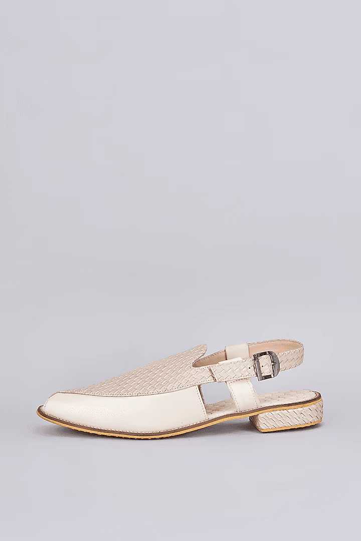 A pair of off white full grain leather based handcrafted slip on mules. It has a padded leather lining and a hard sheeted rubber sole.