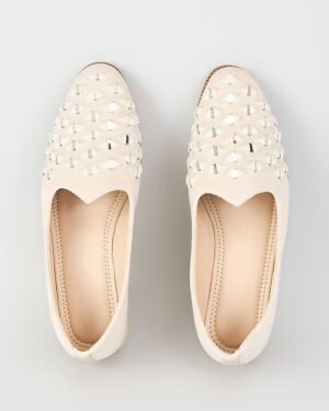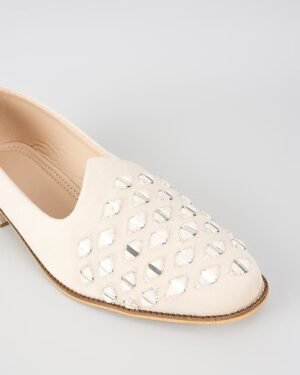 A pair of off white suede velvet based slip on loafers enhanced with geometric mirror embroidery. It has a padded leather lining and a hard sheeted rubber sole.