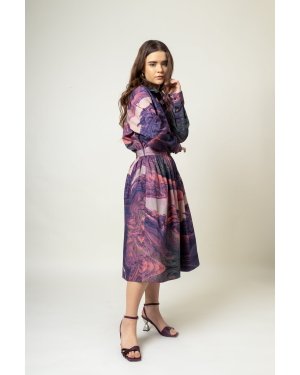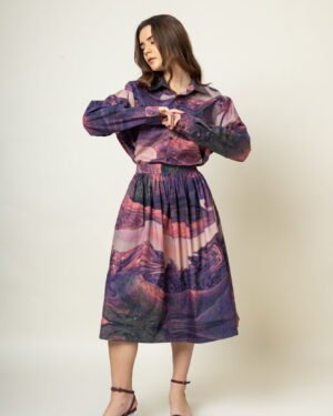 Printed gathered skirtFit: ComfortableFabric: Upcycled cotton (factory deadstock)Length: 28″Color: Purple