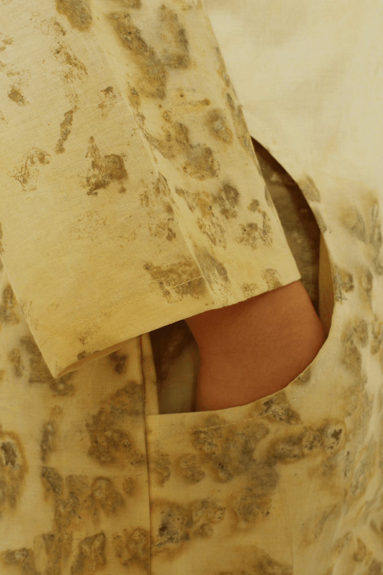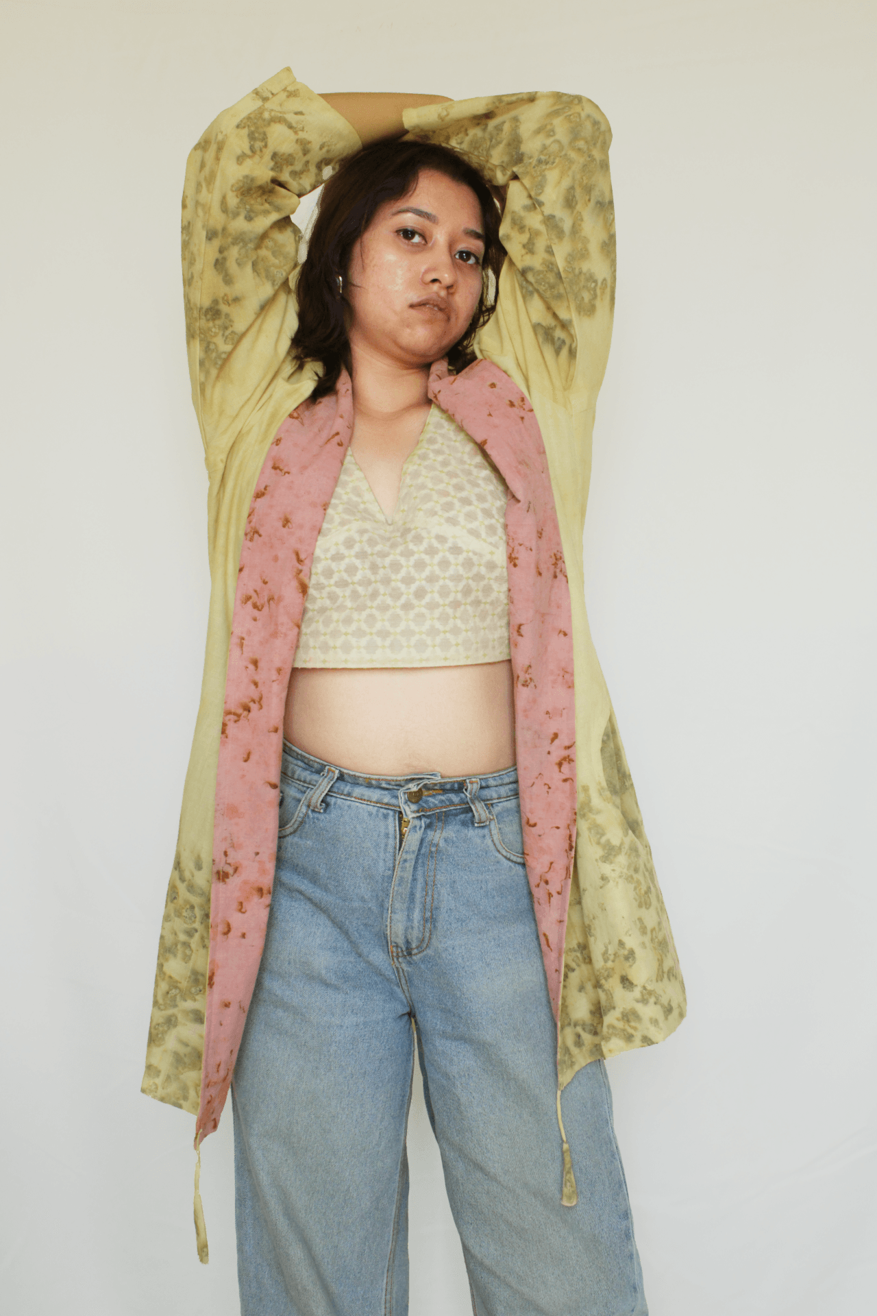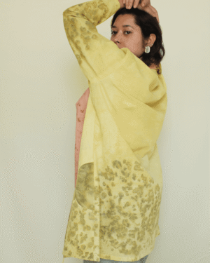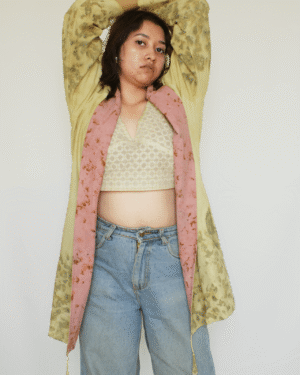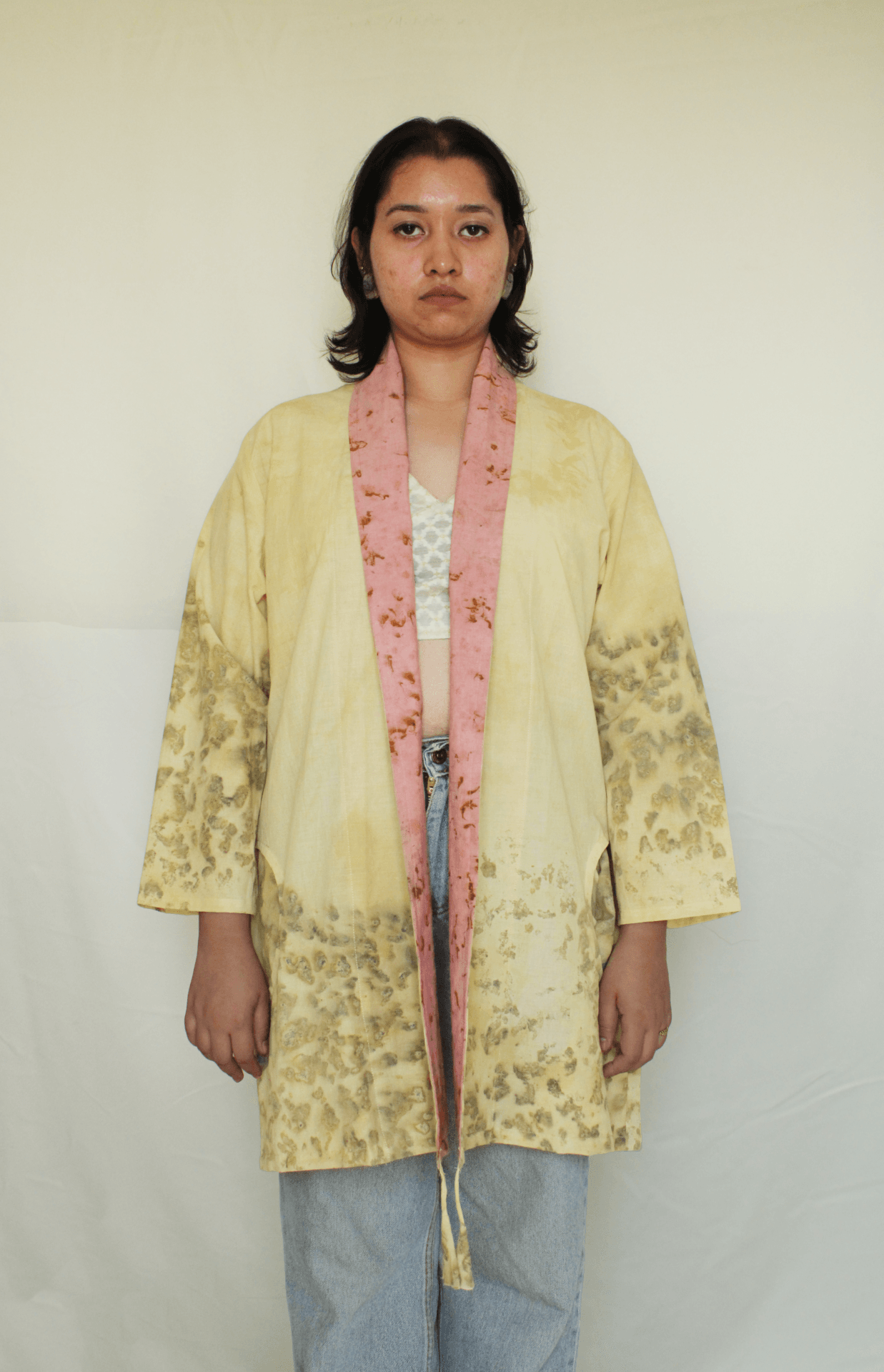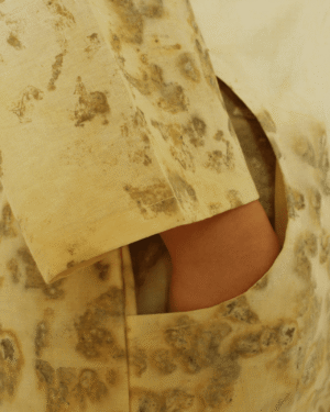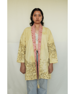 Bageeya's "Karma Kaleidoscope" Jacket embraces eco-conscious style with this unique jacket. Crafted from sustainably sourced Organic Cambric cotton and dyed by hand with sacred temple flowers, this piece offers both comfort and a commitment to reducing environmental impact. Featuring a timeless shawl collar and intricate tessal details, it adds a touch of effortless elegance to any outfit. Our Karma Kaleidoscope jacket is a testament to sustainable practices. Made from luxurious Cambric cotton, known for its breathability and softness, it drapes beautifully on the body. The unique dye process utilizes Harda and Rose, natural pigments extracted from sacred temple flowers. This not only imbues the jacket with subtle color but also contributes to reducing environmental pollution caused by discarded temple offerings. Crafted with meticulous attention to detail, this jacket boasts a timeless design that transcends trends. The shawl collar adds a touch of sophistication, while the intricate tessal details at the