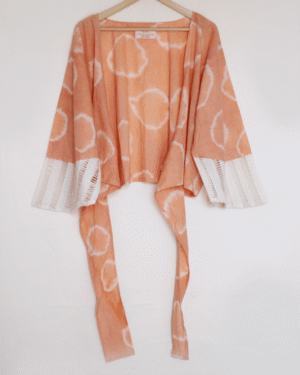 Bageeya's "Katha" Breezy tie-up indulges in effortless style featuring romantic bell sleeves of lace fabric. Made from breathable Organic Cambric cotton, this top is perfect for warm days. Look closer and discover the unique charm - the fabric is dyed using a time-honored technique with Ayurvedic herb Catechu, all-natural and kind to the environment. Crafted from pure Cambric cotton, our Breezy tie-up tops offer unparalleled comfort and breathability. The fabric is luxuriously soft against the skin, making it ideal for warmer weather. But what truly sets this top apart is its remarkable dye story. We use a traditional tie-and-dye technique to infuse the fabric with vibrant colors derived from natural sources - Catechu. This eco-conscious approach not only creates stunning visual effects but also helps reduce marine pollution caused by synthetic dyes. The Katha Breezy tie-up is a beautiful fusion of comfort and style. The relaxed silhouette features a charming