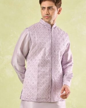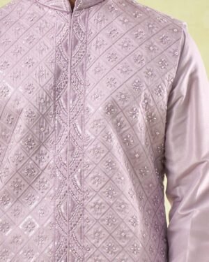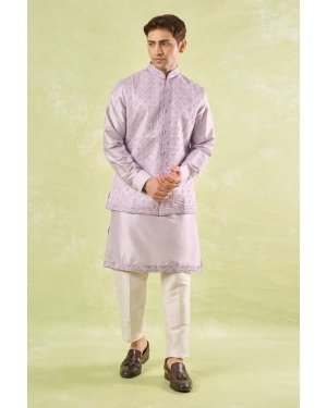 Lavender raw silk based jacket enhanced with thread and sequin embroidery paired with a matching cotton silk based kurta and an off white dupion silk based mexican pants.