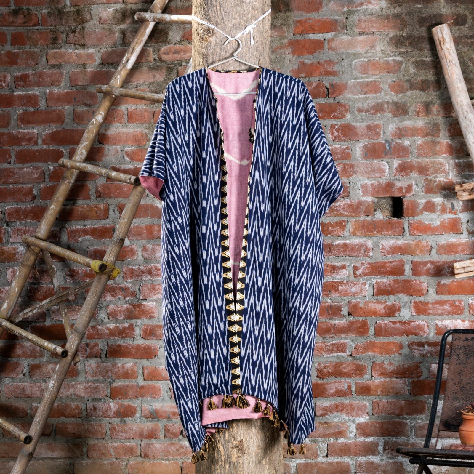 Bageeya's "Lehriya Lili" Reversible pasban Jackets elevates your style?a harmonious blend of tradition and trend. Crafted from Khadi Tussar cotton by local artisans in Nagpur, one side boasts Lac tie and dye with a patch pocket, while the other showcases block-printed fabric. This long, flowy jacket is adorned with playful tassels, creating a versatile and chic wardrobe essential. Immerse yourself in the rich heritage of Nagpur, with our Reversible Pasban Jackets. The tie and dye method using Lac on one side is a meticulous craft, ensuring a unique and organic touch to each piece. The organic tussar cotton sourced locally supports the skilled weavers of the region. Our trained artisans masterfully apply the Sandalwood dye, creating a sustainable and eco-friendly garment. The reversible side features vibrant block-printed fabric, adding a dynamic contrast. Embrace the essence of Indian craftsmanship and sustainable fashion with every wear. Step into a world of bohemian