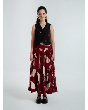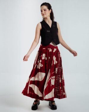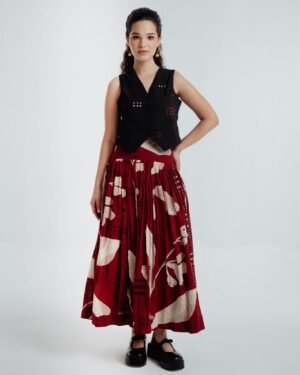 This bohemian skirt features 40 delicate panels with two contrasting prints that gently cascade into a subtly textured fabric, enhancing its overall structure.A broad waistband skirt provides a fitted look at the waist, allowing the skirt to fall beautifully and create graceful volume.This bohemian black waistcoat showcases delicate embroidery in contrasting red and beige hues that beautifully complement the skirt. Crafted from fine handwoven organic cotton spun in Bengal, it features a lined interior for a crisp, structured fit.Versatile and elegant, this waistcoat pairs effortlessly with the skirt or can be styled with various pieces from your wardrobe.The Skirt length is 36 inches , Waistcoat length 17 inchesModel height is 5"7 wearing S