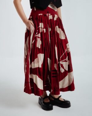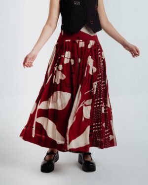 This bohemian skirt features 40 delicate panels with two contrasting prints that gently cascade into a subtly textured fabric, enhancing its overall structure.A broad waistband skirt provides a fitted look at the waist, allowing the skirt to fall beautifully and create graceful volume.The garment length is 36 inchesModel height is 5"7 wearing S