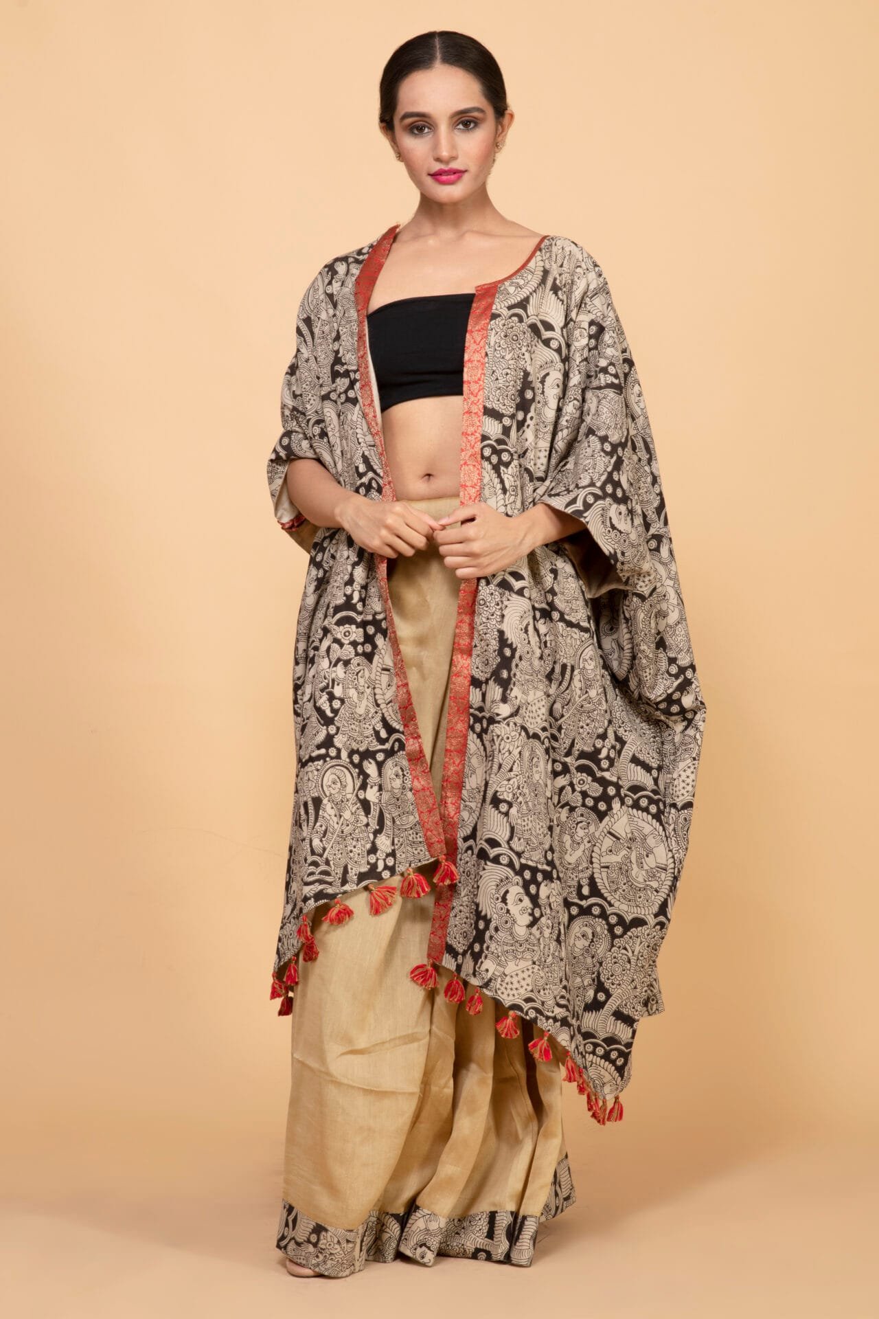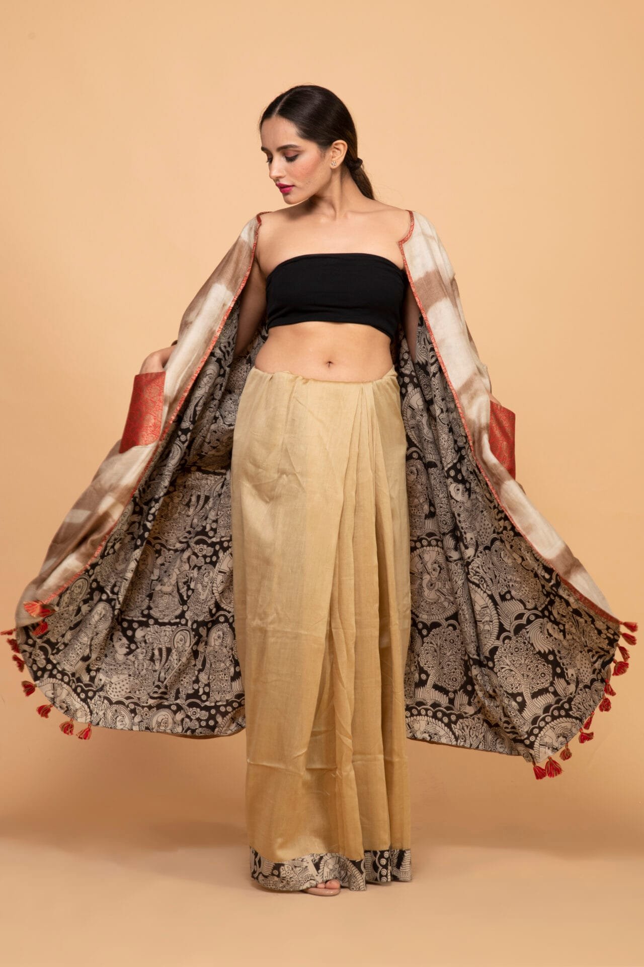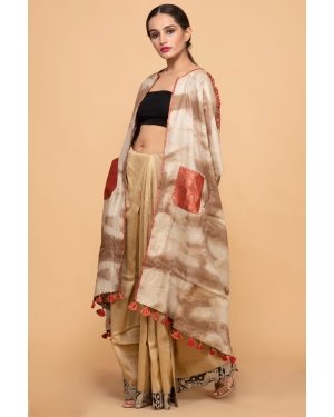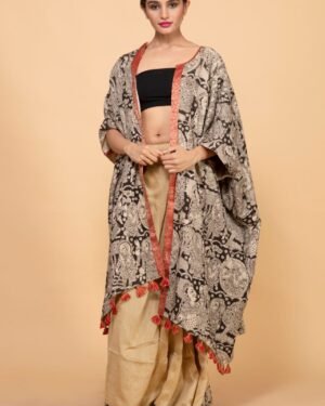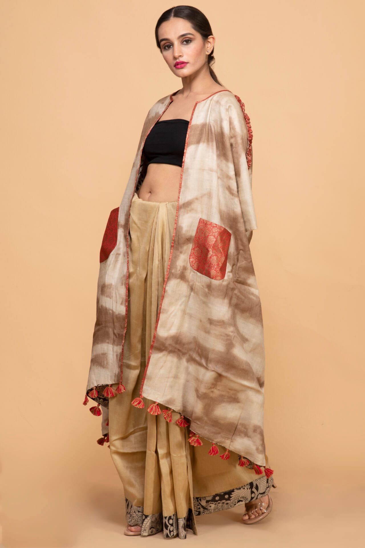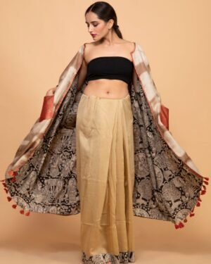 Bageeya's "Matti" Reversible pasban Jackets elevates your style?a harmonious blend of tradition and trend. Crafted from Khadi Tussar cotton by local artisans in Nagpur, one side boasts walnut tie and dye with a patch pocket, while the other showcases block-printed fabric. This long, flowy jacket is adorned with playful tassels, creating a versatile and chic wardrobe essential. Immerse yourself in the rich heritage of Nagpur, with our Reversible Pasban Jackets. The tie and dye method using walnut on one side is a meticulous craft, ensuring a unique and organic touch to each piece. The organic cotton sourced locally supports the skilled weavers of the region. Our trained artisans masterfully apply the walnut dye, creating a sustainable and eco-friendly garment. The reversible side features vibrant block-printed fabric, adding a dynamic contrast. Embrace the essence of Indian craftsmanship and sustainable fashion with every wear. Step into a world of bohemian elegance with