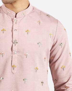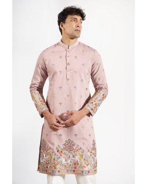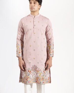 Mauve silk based kurta enhanced with resham and sequins embroidery, paired with an off white dupion silk based pants.