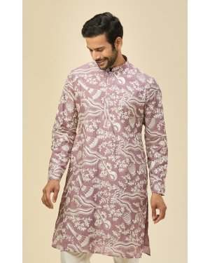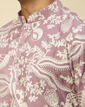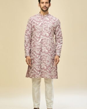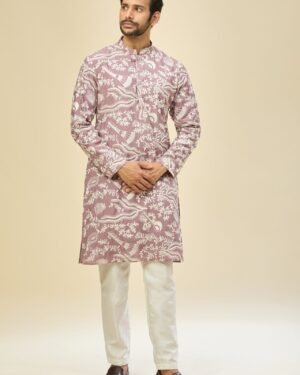 Mauve Pink crepe silk based kurta enhanced with thread embroidery, paired with an off white dupion silk based mexican pants.