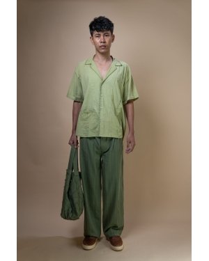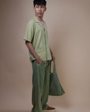 Crafted from 100% cotton fibers and natural materials, the Meadows Bush Shirt is made from handwoven sage green cotton, naturally dyed with indigo and pomegranate. The subtle slubbed texture of the fabric gives it a unique character.