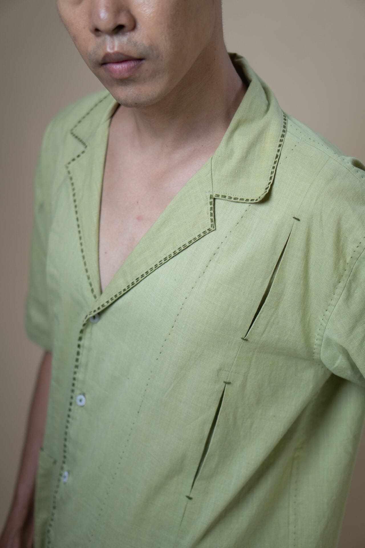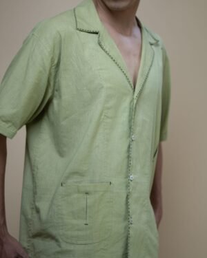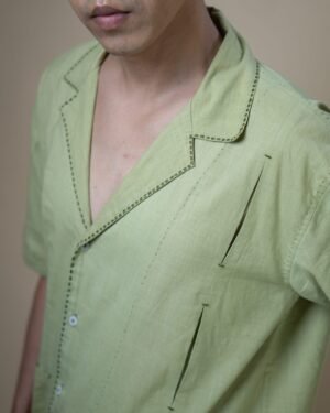 The shirt features a relaxed-fit silhouette with a cuban collar and Kantha detailing. An inverted pleat on one side and notched finishes add thoughtful detail, while a single patch pocket with matching pleat and notch accents completes the design.