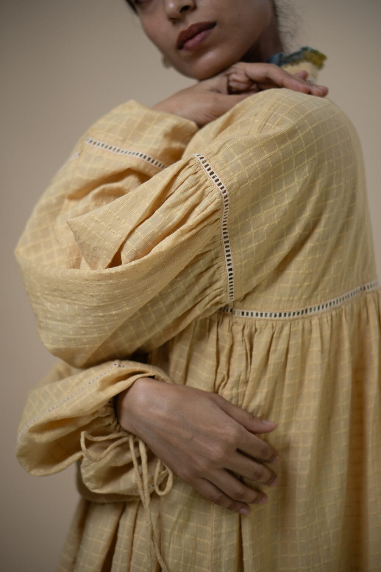 Crafted from 100% cotton fibers and natural materials, the Meadows Gathered Short Dress is naturally dyed using Myrobalan and Madder.
