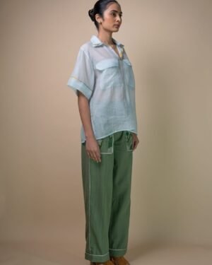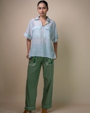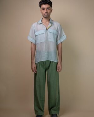 The boxy half-sleeve design is unisex and serves as an elevated staple. The shirt features a double collar adorned with hand-painted mulmul piping. The sheer fabric is a standout feature, complemented by side slits and two large patch pockets. Kantha detailing adds texture, highlighting these thoughtful design elements.