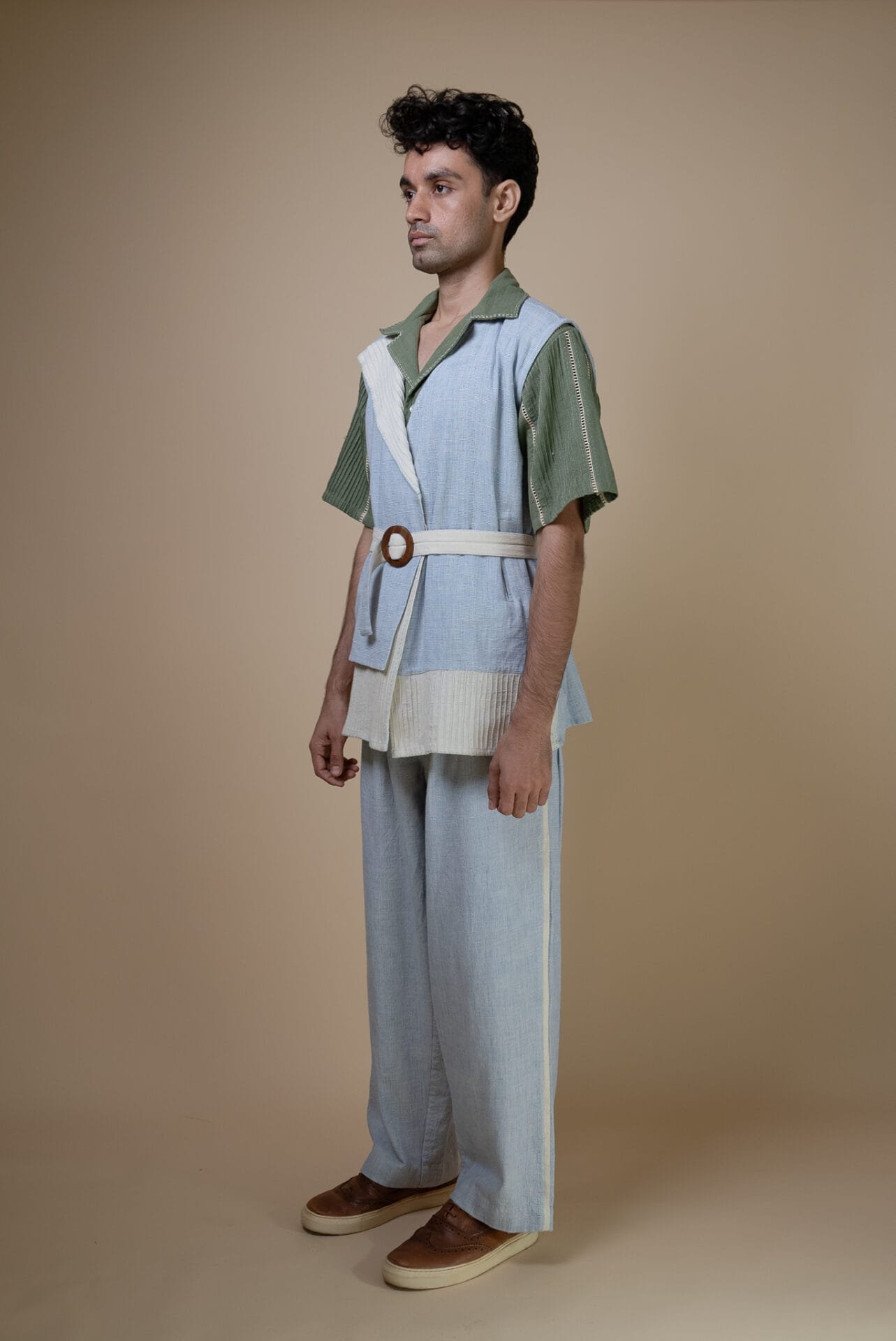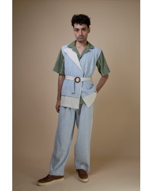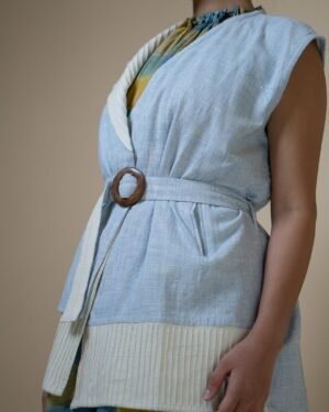 Functionality meets style with a belt to cinch the waist for a flattering fit and welt pockets for convenience. Hand-embroidered Kantha details add a touch of artisanal craftsmanship, making it a versatile wardrobe staple.