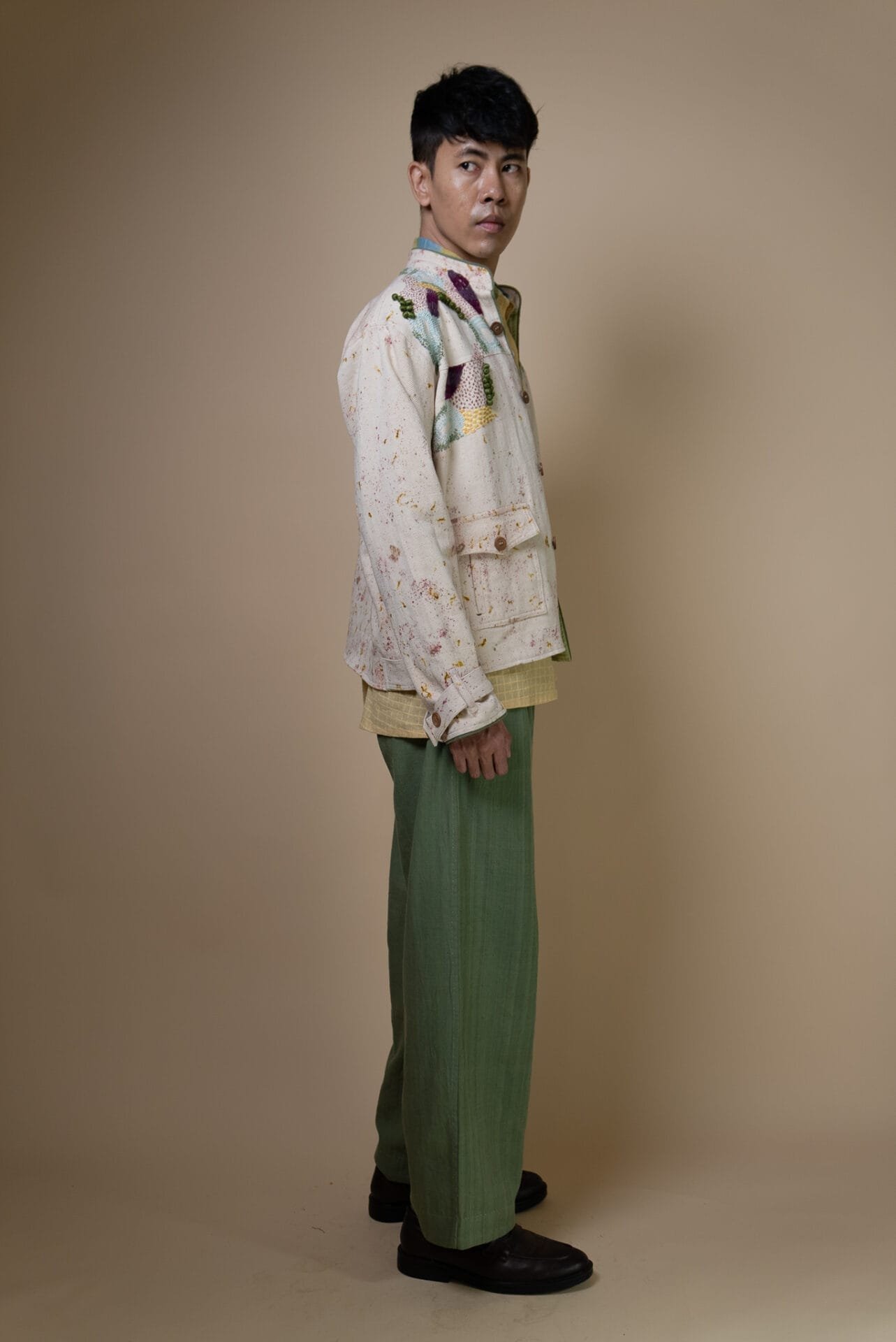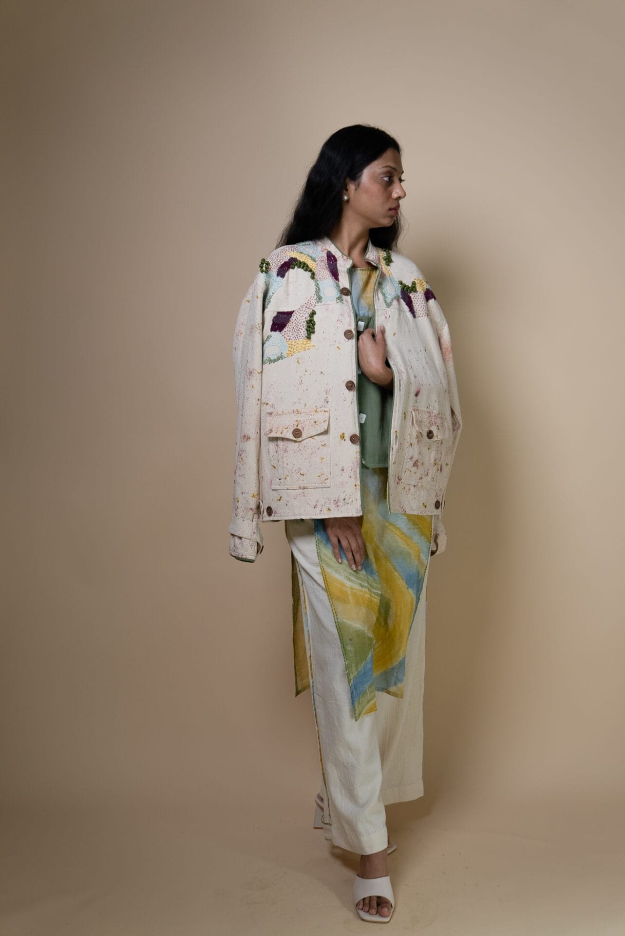 The intricate hand embroidery showcases a mix of techniques? embellishments with wooden beads, delicate French knots, bullion knots, lazy daisy, and traditional kantha stitches. Flowing organically from the shoulder, the embroidery mimics the natural spread of moss, giving each jacket a unique, handcrafted finish.