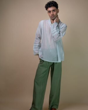 This breezy, simple top features inverted pleats in the front and a raised collar adorned with hand-painted Mulmul piping. The sleeves are accented with horizontal knife pleats and Kantha lines, adding texture and detail. This unisex staple is perfect for transeasonal wear, making it ideal for layering or on warmer days.