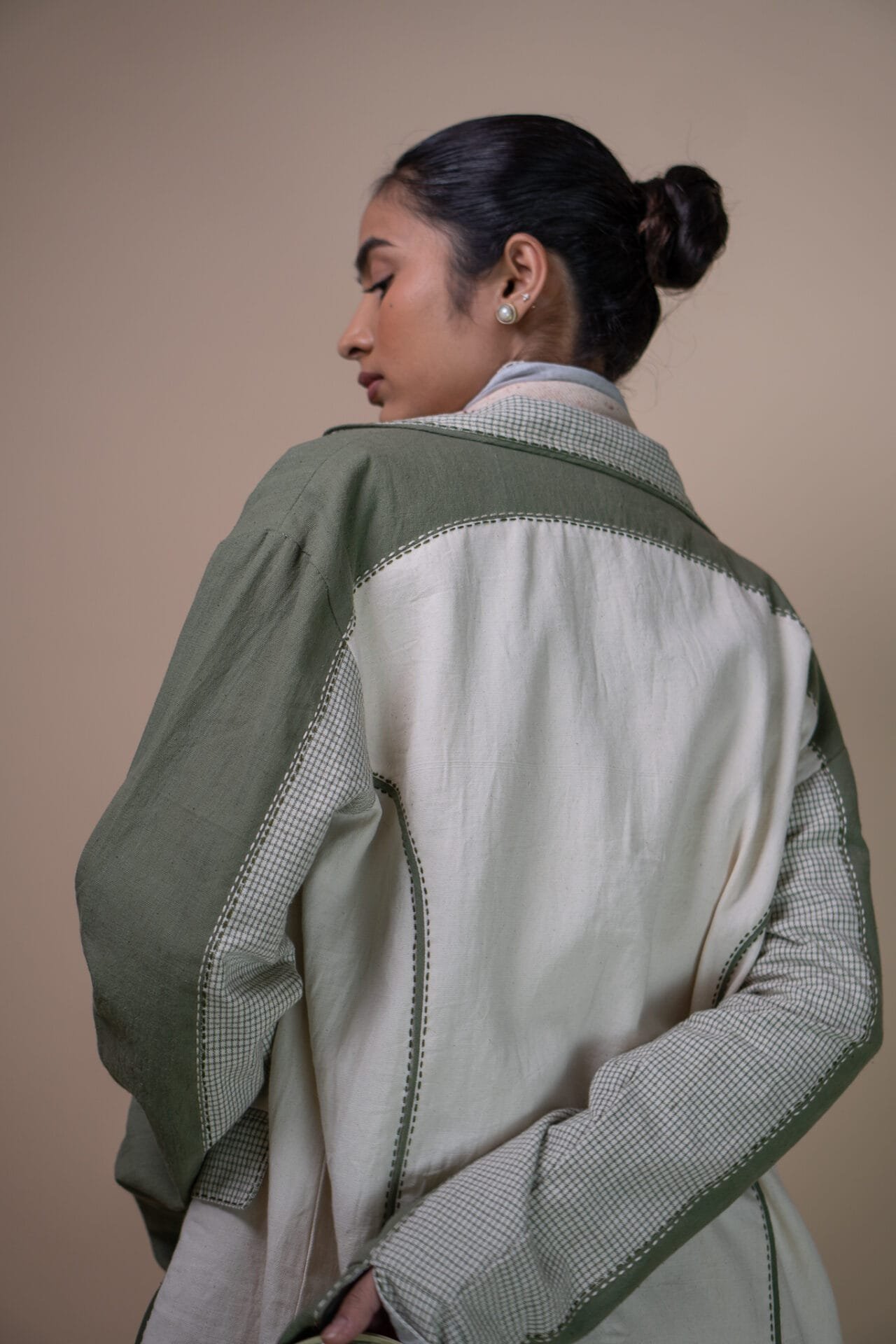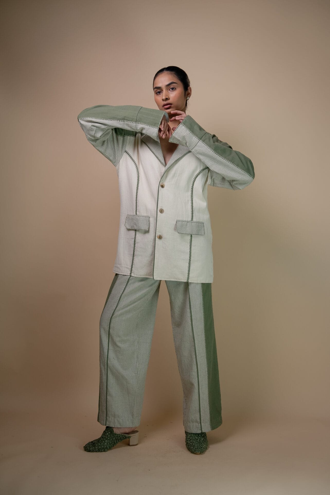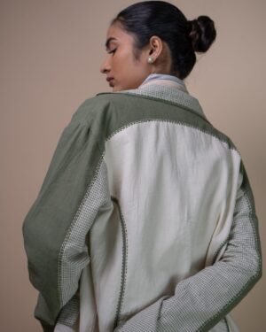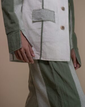 Crafted from 100% cotton fibers and natural materials, this blazer thoughtfully combines both solid and checkered Kala cotton, azo-free dyed in a trans-seasonal olive colour; with undyed Kala Cotton.