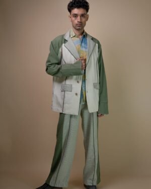 Featuring raglan sleeves and wide lapels, the blazer is detailed with welt pockets and contrasting piping along the panels. Long cuffs with slits and traditional Kantha lines enhance its artisanal appeal.