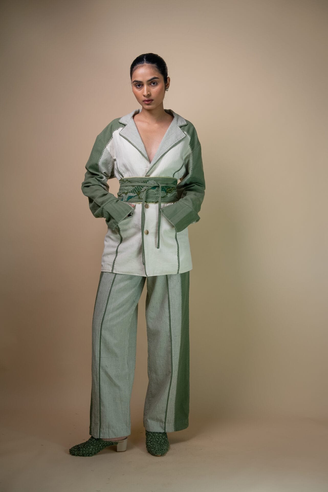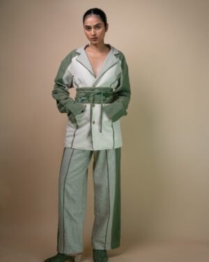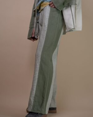Designed with a high waist and straight-leg silhouette, these pants feature round-cut pockets and olive piping along the front and back panels. Discreet drawstrings on the inside ensure a better fit, solid olive side panels add contrast, and traditional Kantha embroidery add to the tactile quality of the fabric.