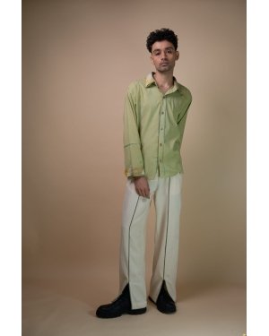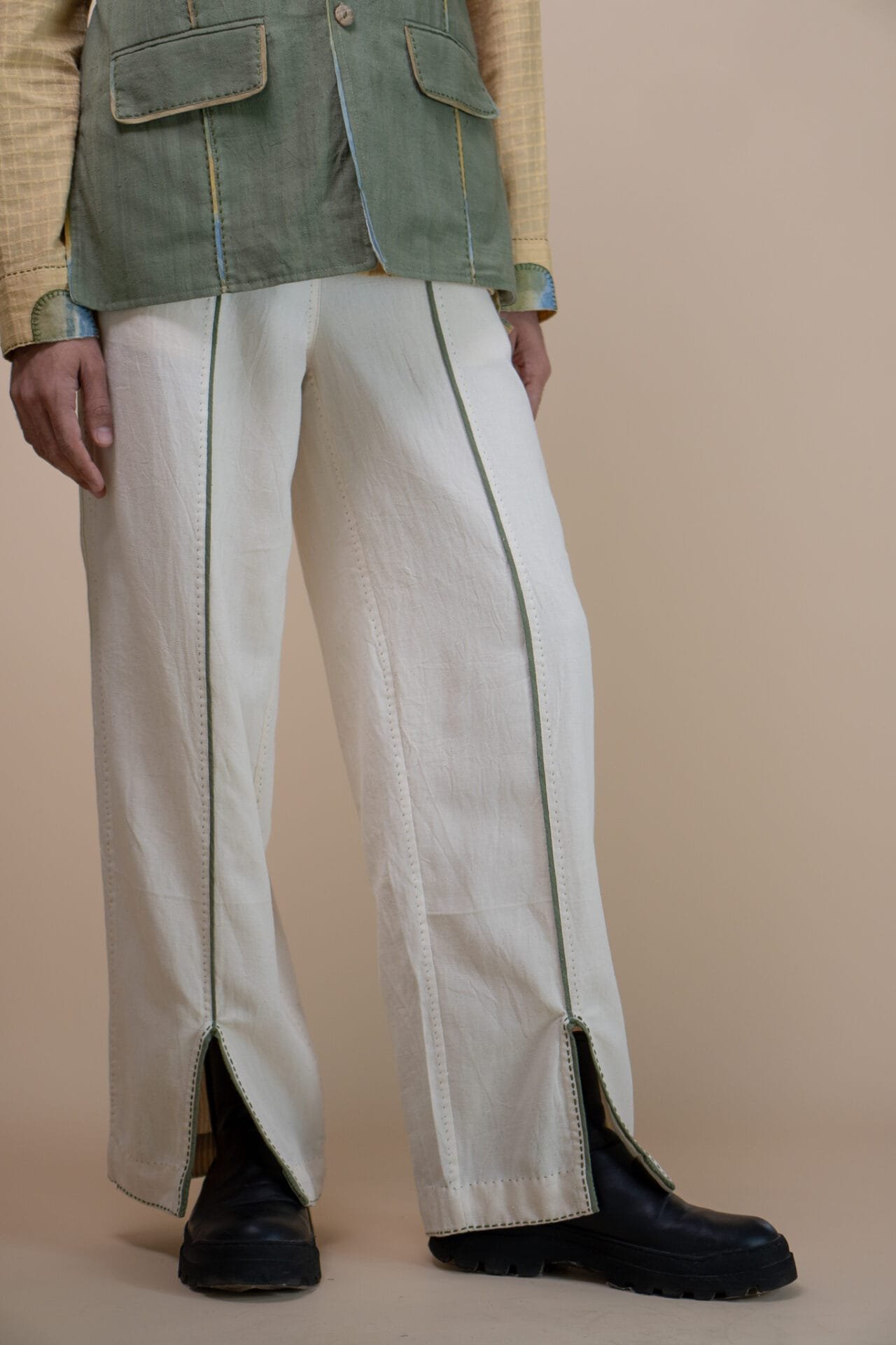 This straight-fit silhouette features a high-waist design with front slits at the hem, accented by olive green piping along the centre and on the cutaway side-pockets. Discreet drawstrings ensure an adjustable fit, while pintucked panels at the back add texture and structure. Subtle Kantha detailing along the hem brings a touch of hand-embroidered detail to these off-white pants.