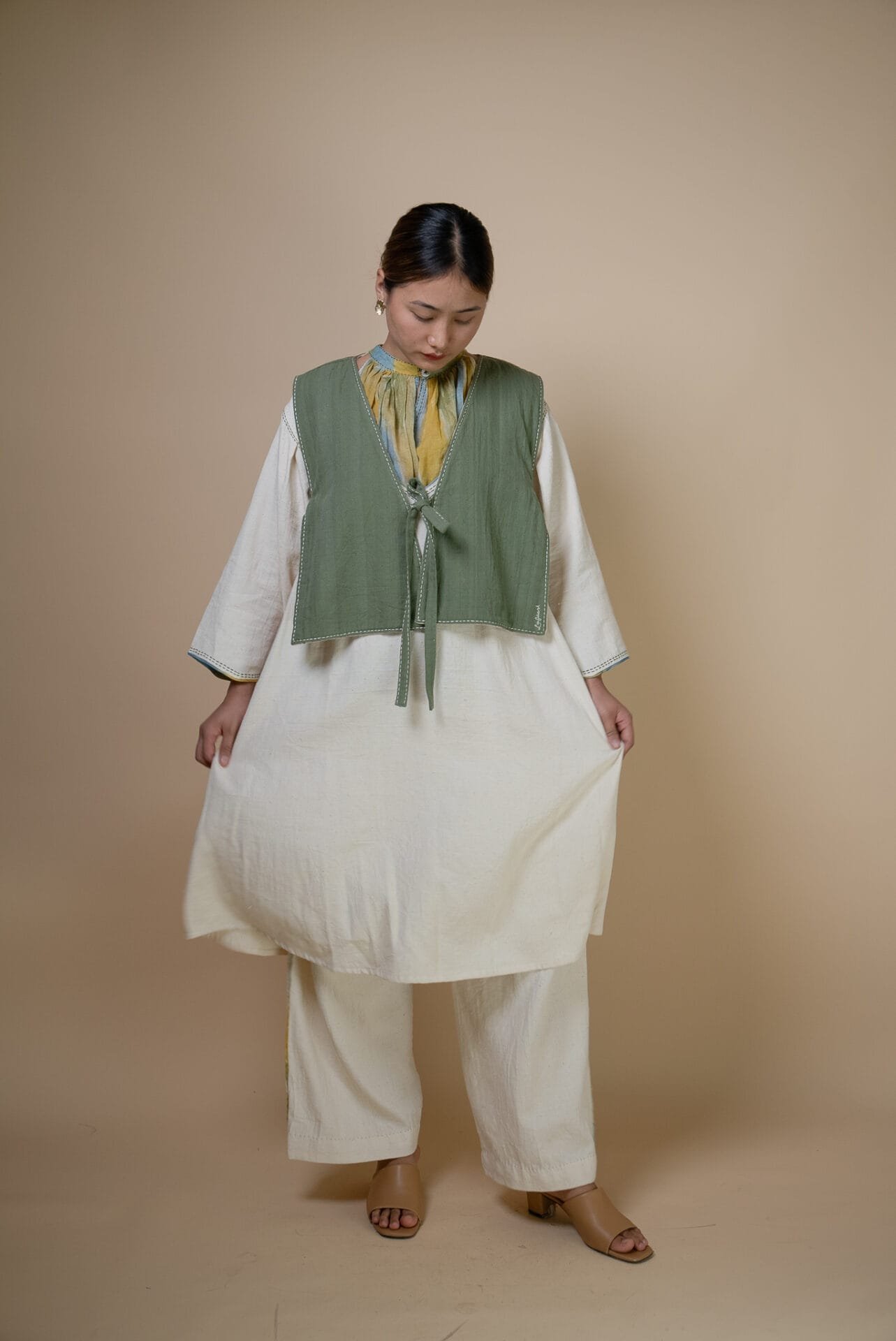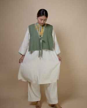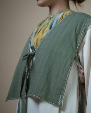 This reversible silhouette is free size, featuring tie-ups both on the front and sides. The broad belts at the sides taper to a slimmer design at the front. The denim side is richly embroidered, while the solid olive Kala Cotton has clean Kantha stitches, making it versatile to dress up or down.