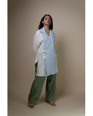 This long blazer features high side slits and a colour-blocking design that accentuates its inherent elegance. The double-breasted silhouette is completed with ties on the side, while piping detail on the lapel adds a refined touch. Pockets add functionality, and Kantha embroidery along the panels add to its handcrafted appeal.