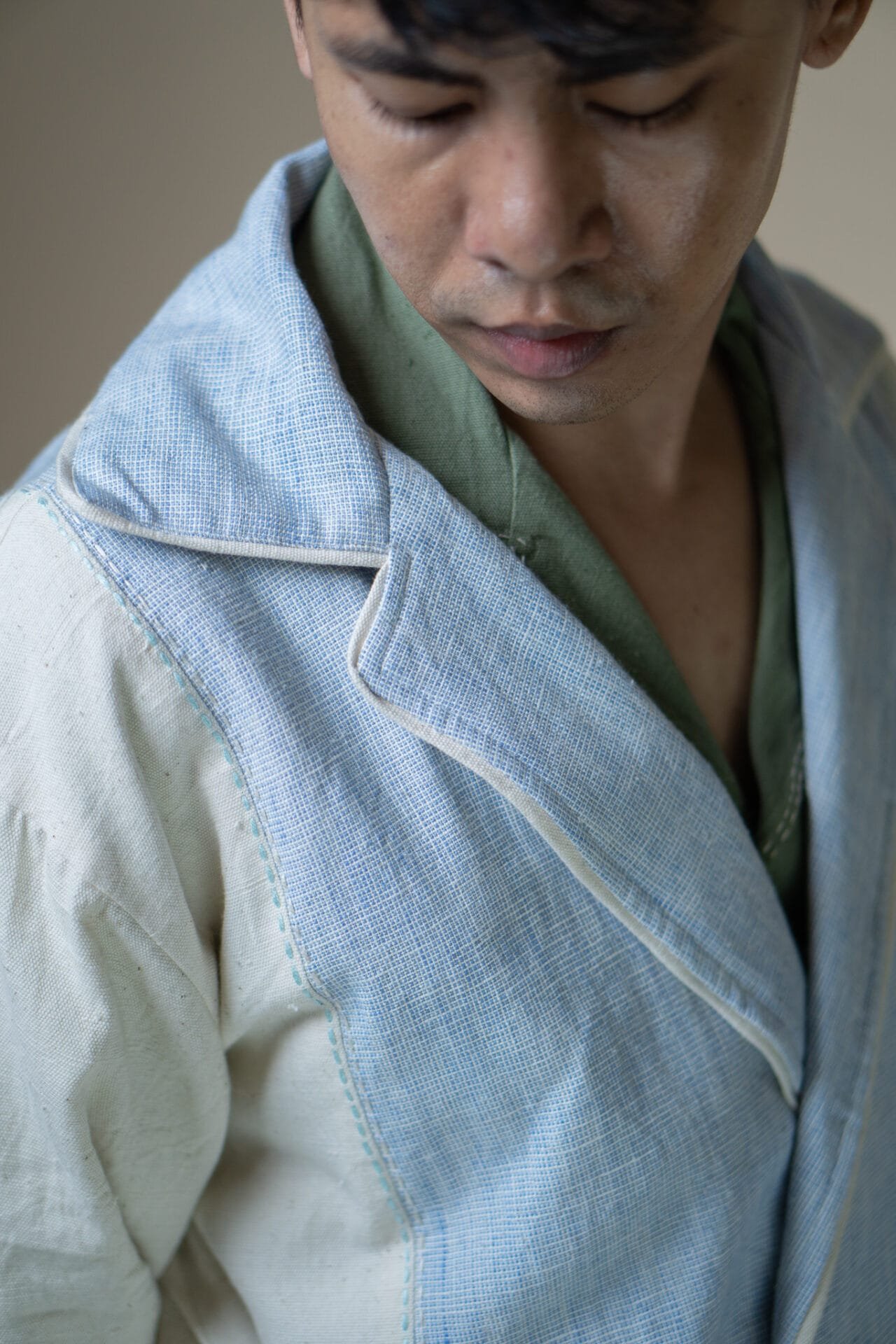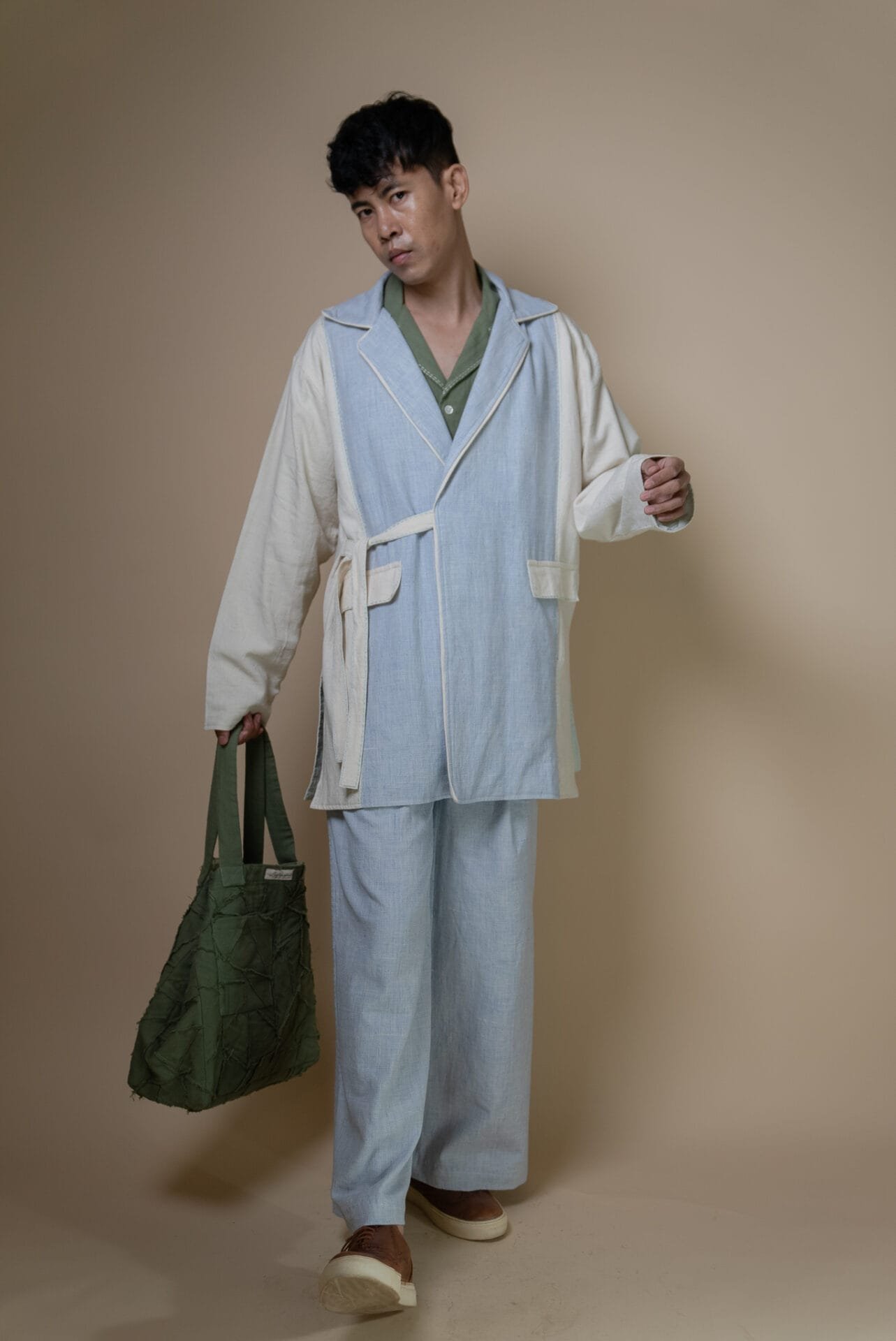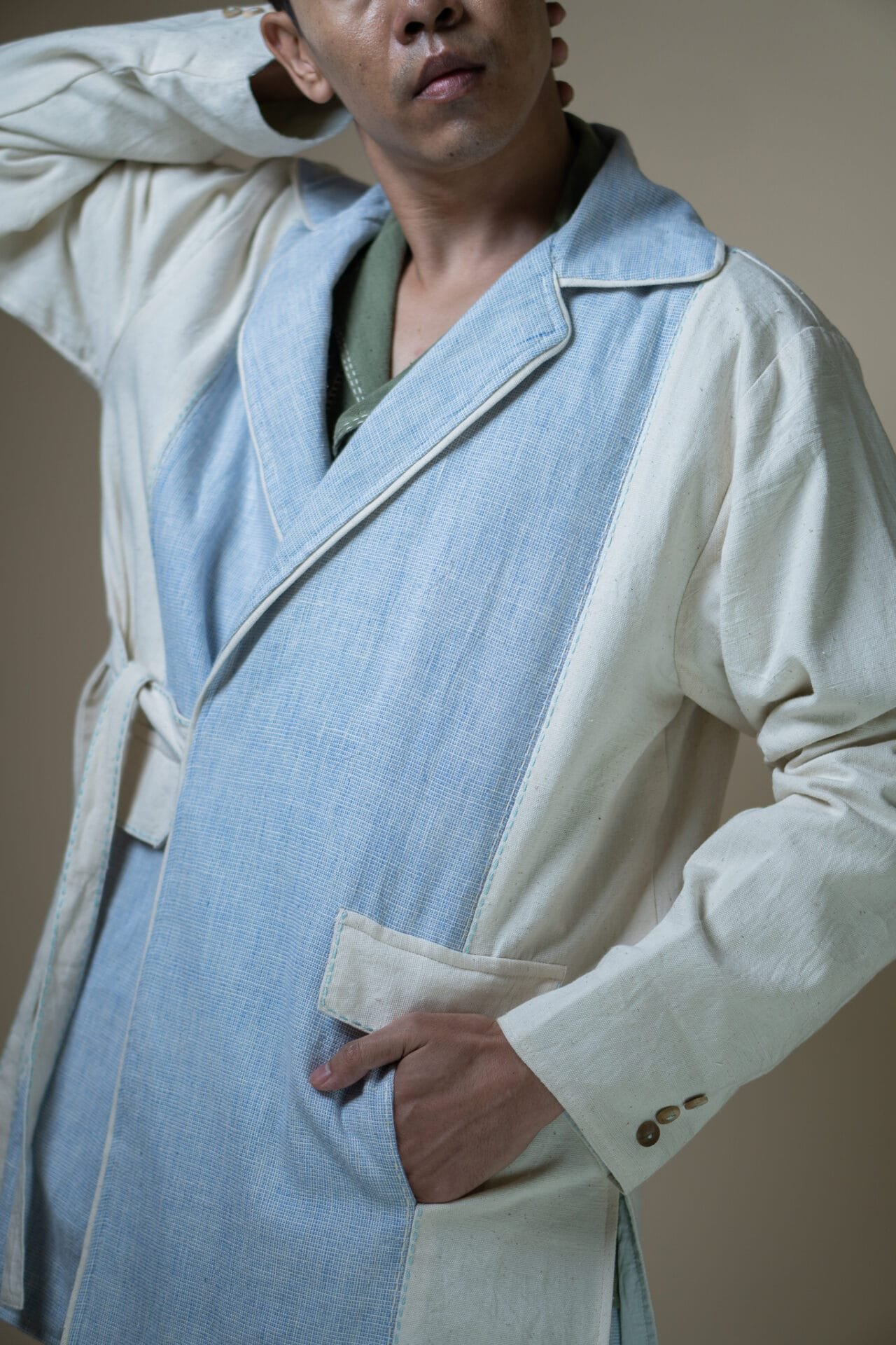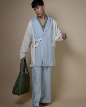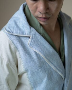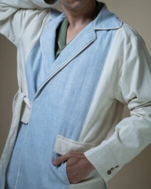 Crafted from 100% cotton fibers and natural materials, the Meadows Unisex Tie Up Blazer features a harmonious blend of Azo-free dyed blue handwoven fabric and undyed Kala Cotton.