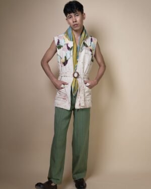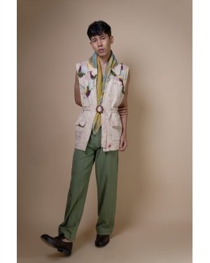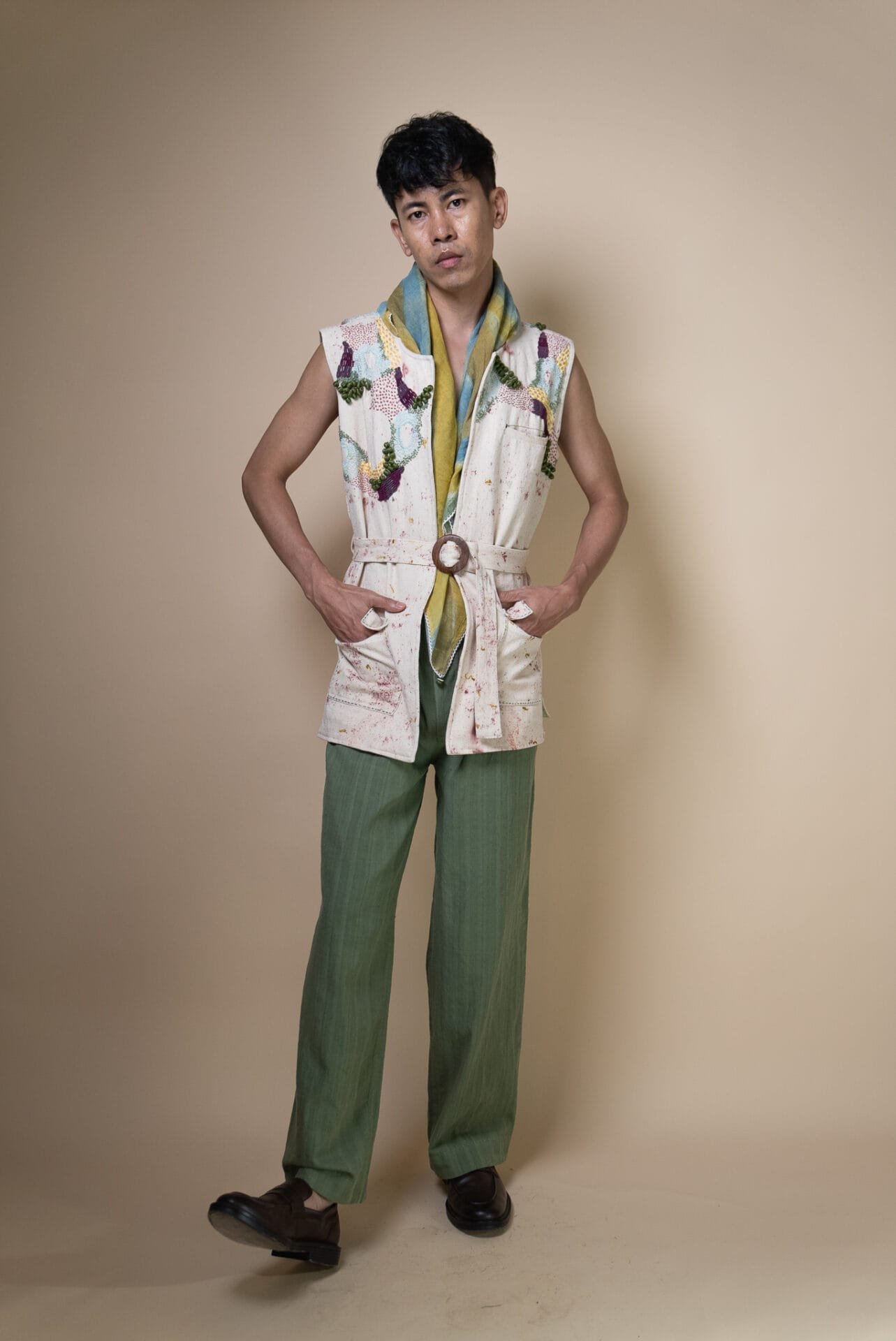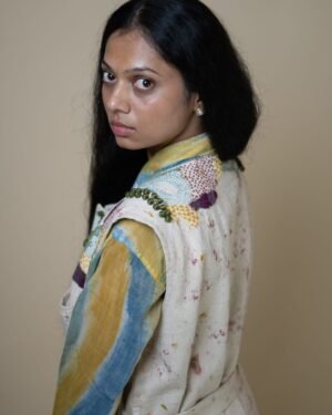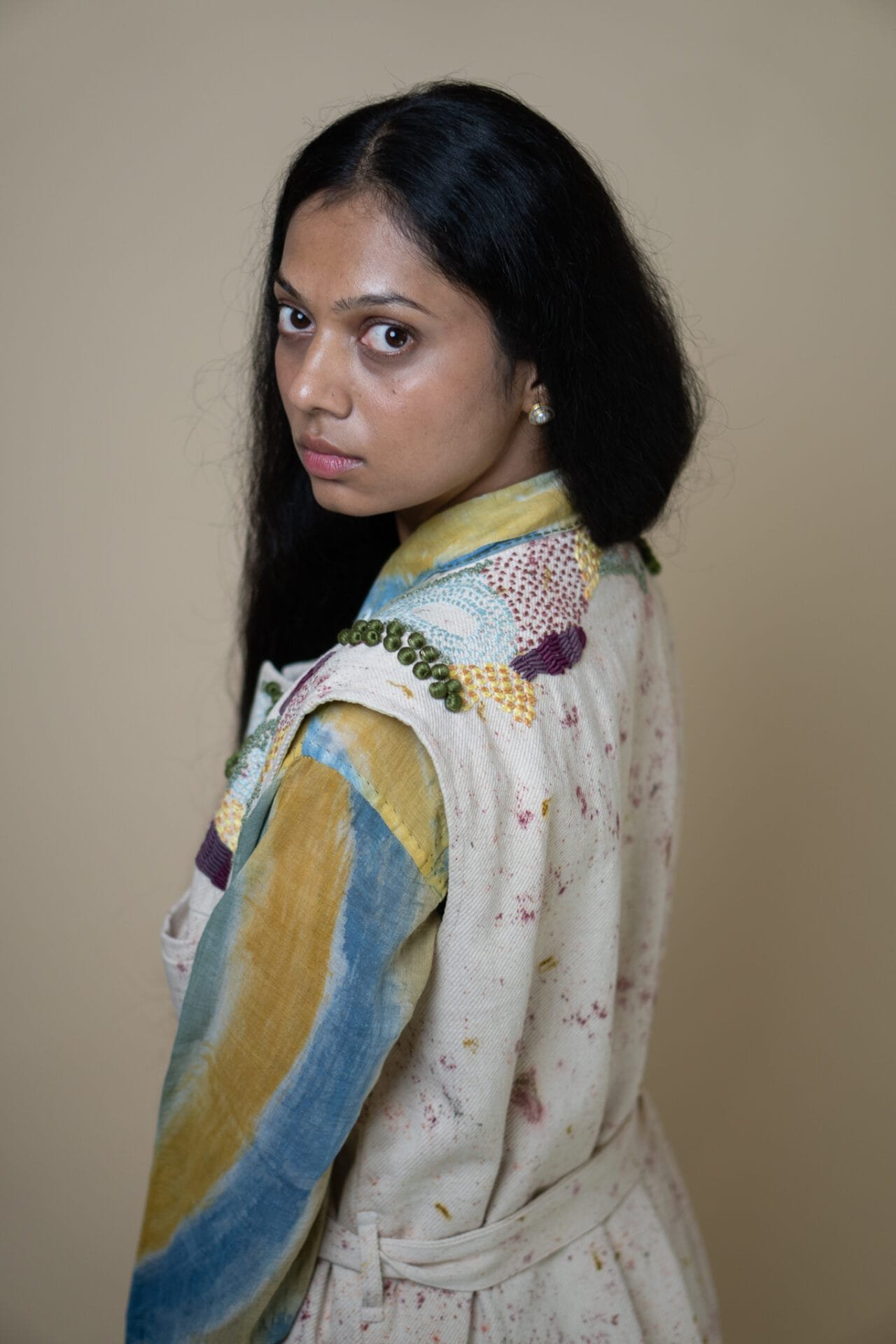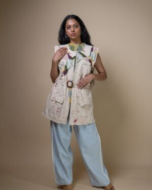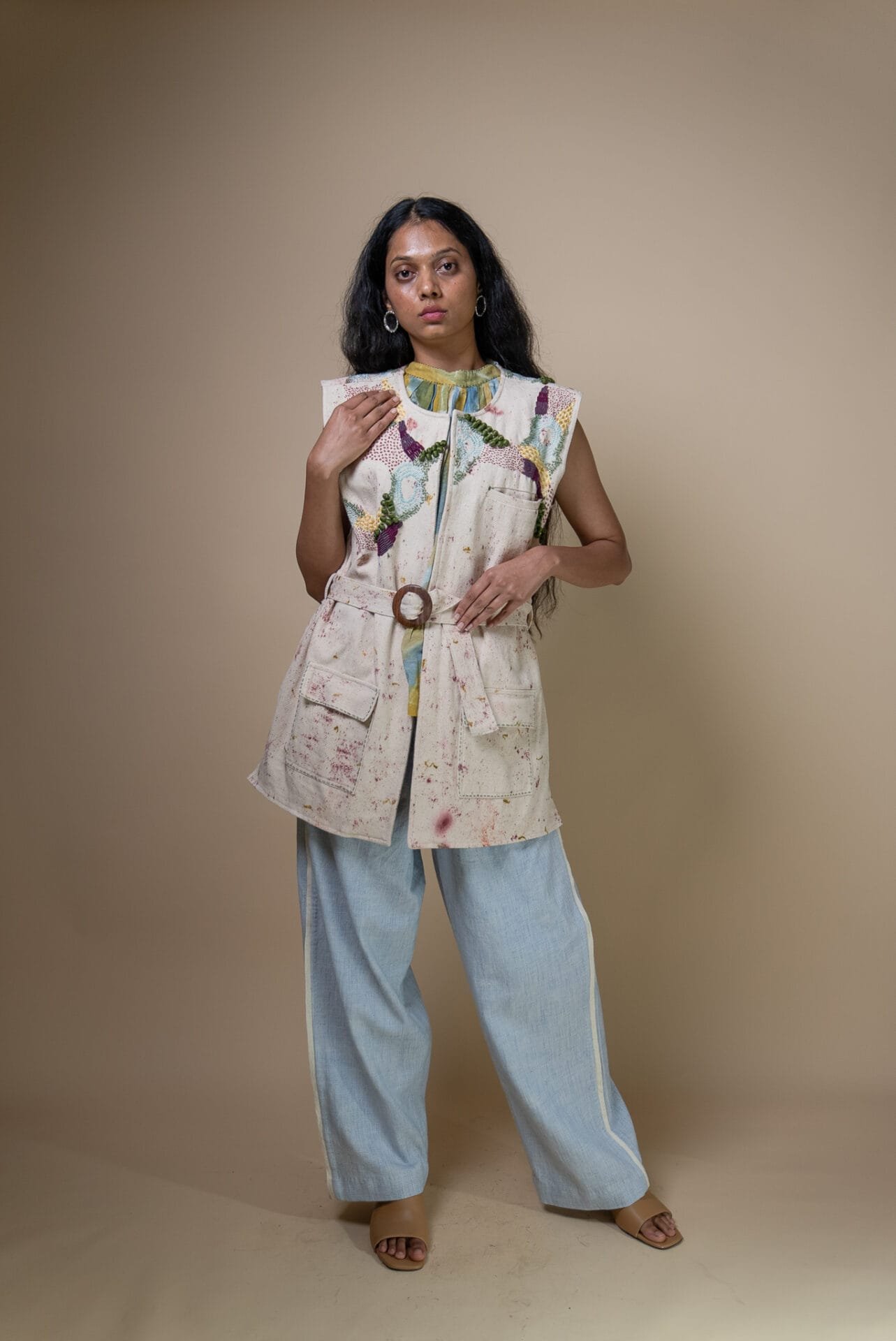 Featuring a classic fit, the vest is designed with a round collar front, belt, and functional patch pockets. The intricate embroidery showcases an array of intuitive techniques?3D embellishments with wooden beads, delicate french knots, bullion knots, lazy daisy, and traditional kantha stitches. The embroidery spreads organically in the front, mimicking the natural flow of moss, giving each jacket a one-of-a-kind, handcrafted finish.