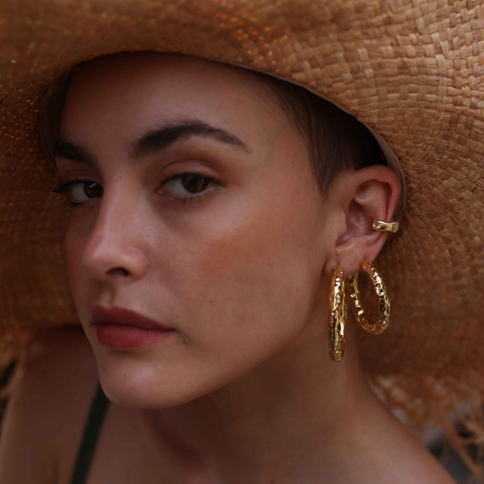 Add a refined touch of modern elegance to your jewelry collection with these Medium Etched Hoop Earrings, thoughtfully designed for women and girls who love timeless style with subtle texture.Each hoop showcases a distinct etched, raw-textured surface that enhances depth and visual interest while maintaining a clean, minimalist aesthetic. Crafted from a premium brass alloy and finished with 22KT real gold plating, these earrings deliver a rich gold look without compromising comfort or wearability.The Medium hoop silhouette makes them ideal for everyday wear?lightweight enough for all-day comfort and versatile enough to transition seamlessly from casual outfits to workwear or evening looks. Their understated design allows them to be worn alone for a polished finish or layered with other earrings for a curated, modern style.Textured etched hoop design with a raw, modern finish22KT real gold plating for a warm, luxurious appearancePremium brass alloy base for durability and long-lasting useLightweight Medium hoops